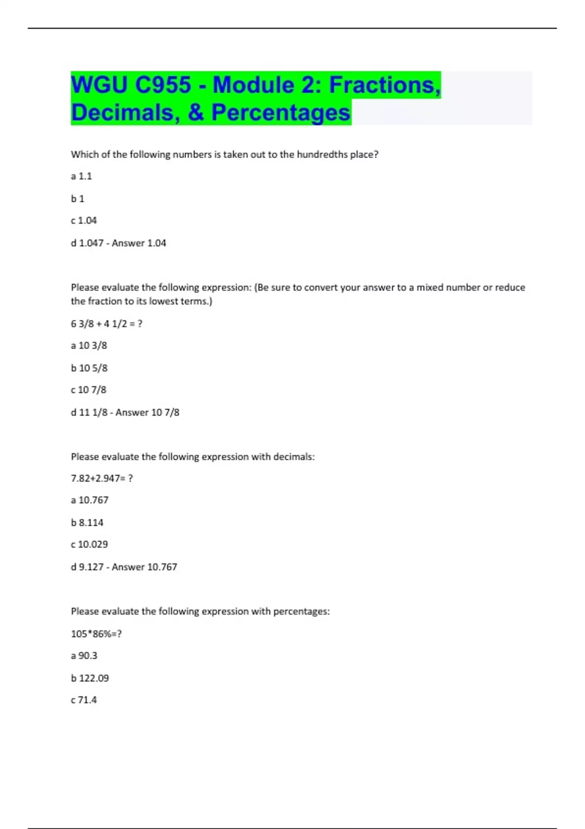 Which of the following numbers is taken out to the hundredths place? a 1.1 b 1 c 1.04 d 1.047 - Answer 1.04 Please evaluate the following expression: (Be sure to convert your answer to a mixed number or reduce the fraction to its lowest terms.) 6 3/8 + 4 1/2 = ? a 10 3/8 b 10 5/8 c 10 7/8 d 11 1/8 - Answer 10 7/8 Please evaluate the following expression with decimals: 7.82+2.947= ? a 10.767 b 8.114 c 10.029 d 9.127 - Answer 10.767 Please evaluate the following expression with percentages: 105*86%=? a 90.3 b 122.09 c 71.4d 154.41 - Answer 90.3 Please evaluate the following expression: (Reduce your answer to its lowest terms.) −7 5/9 / 4 3/4 = ? a −1 101/171 b −7 8/13 c −7 3/4 d −5 2/3 - Answer -1 101/171 Please evaluate the following expression with decimals: 0.054 / 1.8= ? a 0.03 b 0.3 c 0.333 d 3.33 - Answer 0.03 Please evaluate the following expression with decimals: 4.90*0.78= ? a 3.1902 b 3.822 c 4.263 d 3.553 - Answer 3.822