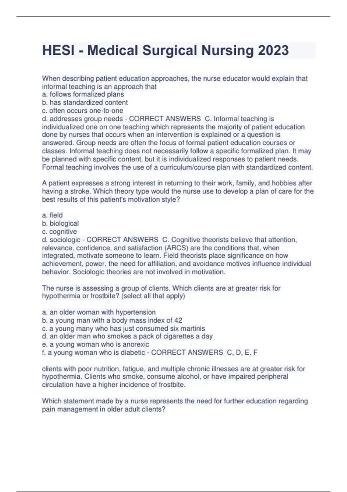HESI - Medical Surgical Nursing 2023 When describing patient education approaches, the nurse educator would explain that informal teaching is an approach that a. follows formalized plans b. has standardized content c. often occurs one-to-one d. addresses group needs - CORRECT ANSWERS C. Informal teaching is individualized one on one teaching which represents the majority of patient education done by nurses that occurs when an intervention is explained or a question is answered. Group needs are often the focus of formal patient education courses or classes. Informal teaching does not necessarily follow a specific formalized plan. It may be planned with specific content, but it is individualized responses to patient needs. Formal teaching involves the use of a curriculum/course plan with standardized content. A patient expresses a strong interest in returning to their work, family, and hobbies after having a stroke. Which theory type would the nurse use to develop a plan of care for the best results of this patient's motivation style? a. field b. biological c. cognitive d. sociologic - CORRECT ANSWERS C. Cognitive theorists believe that attention, relevance, confidence, and satisfaction (ARCS) are the conditions that, when integrated, motivate someone to learn. Field theorists place significance on how achievement, power, the need for affiliation, and avoidance motives influence individual behavior. Sociologic theories are not involved in motivation. The nurse is assessing a group of clients. Which clients are at greater risk for hypothermia or frostbite? (select all that apply) a. an older woman with hypertension b. a young man with a body mass index of 42 c. a young many who has just consumed six martinis d. an older man who smokes a pack of cigarettes a day e. a young woman who is anorexic f. a young woman who is diabetic - CORRECT ANSWERS C, D, E, F clients with poor nutrition, fatigue, and multiple chronic illnesses are at greater risk for hypothermia. Clients who smoke, consume alcohol, or have impaired peripheral circulation have a higher incidence of frostbite. Which statement made by a nurse represents the need for further education regarding pain management in older adult clients? a. older adults tend to report pain less often than younger adults b. older clients usually have more experience with pain than younger clients c. older adults are at greatest risk for under treated pain d. older clients have a different pain mechanism and do not feel it as much - CORRECT ANSWERS D There is no evidence to support the idea that older adult clients perceive pain any differently than younger clients. The other statements are accurate regarding older clients and pain. The nurse is working at a first aid booth for a spring training game on a hot day. A spectator comes in, reporting that he is not feeling well. Vital signs are temp 104.1 F, pulse 132 BPM, respirs 26 breaths/min, and blood pressure 106/66 mm Hg. He trips over his feet as the nurse leads him to a cot. What is the priory action of the nurse? a. admin tylenol 650 mg orally b. encourage rest, and reassess in 15 minutes c. sponge the victim with cool water and remove his shirt d. encourage drinking of cool water or sports drink - CORRECT ANSWERS C The spectator shows signs of heat stroke, which is a medical emergency. The spectator should be transported to the ED ASAP. The nurs should take actions to lower his body temp in teh meantime by removing his shirt and sponging his body with cool water. Lowering body temp by drinking cool fluids or taking acetaminophen is not as effective in an emergency situation. The client needs to be cooled quickly and is a priority for treatment The client is receiving an IV of 60 mEq of potassium chloride ina 1000 mL solution of dextrose 5% in 0.45% saline. The client states that the area around the IV site burns. What intervention does the nurse perform first? a. assess for a blood return b. notify the physician c. document the finding d. stop the IV infusion - CORRECT ANSWERS D Potassium is a severe tissue irritant. The safest action is to discontinue the solution that contains the potassium and discontinue the IV altogether, in which case the client would need another site started. Assessing for a blood return may or may not be successful. The solution could be diluted (less potassium) and the rate could be slowed once it is determined that the needle is in the vein. A nurse is caring for an older adult client who lives alone. Which economic situation presents the most serious problem for this client? a. costs of creating a living will b. stock market fluctuations c. increased provider benefits d. social security as the basis of income - CORRECT ANSWE