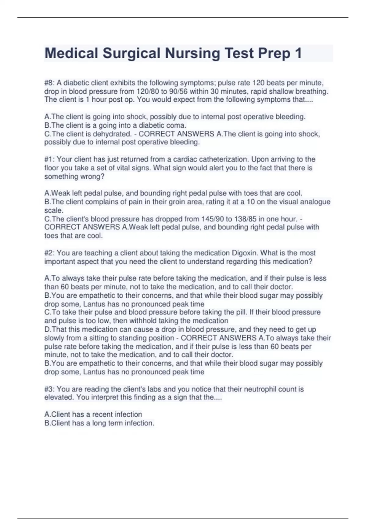 Medical Surgical Nursing Test Prep 1 #8: A diabetic client exhibits the following symptoms; pulse rate 120 beats per minute, drop in blood pressure from 120/80 to 90/56 within 30 minutes, rapid shallow breathing. The client is 1 hour post op. You would expect from the following symptoms that.... A.The client is going into shock, possibly due to internal post operative bleeding. B.The client is a going into a diabetic coma. C.The client is dehydrated. - CORRECT ANSWERS A.The client is going into shock, possibly due to internal post operative bleeding. #1: Your client has just returned from a cardiac catheterization. Upon arriving to the floor you take a set of vital signs. What sign would alert you to the fact that there is something wrong? A.Weak left pedal pulse, and bounding right pedal pulse with toes that are cool. B.The client complains of pain in their groin area, rating it at a 10 on the visual analogue scale. C.The client's blood pressure has dropped from 145/90 to 138/85 in one hour. - CORRECT ANSWERS A.Weak left pedal pulse, and bounding right pedal pulse with toes that are cool. #2: You are teaching a client about taking the medication Digoxin. What is the most important aspect that you need the client to understand regarding this medication? A.To always take their pulse rate before taking the medication, and if their pulse is less than 60 beats per minute, not to take the medication, and to call their doctor. B.You are empathetic to their concerns, and that while their blood sugar may possibly drop some, Lantus has no pronounced peak time C.To take their pulse and blood pressure before taking the pill. If their blood pressure and pulse is too low, then withhold taking the medication D.That this medication can cause a drop in blood pressure, and they need to get up slowly from a sitting to standing position - CORRECT ANSWERS A.To always take their pulse rate before taking the medication, and if their pulse is less than 60 beats per minute, not to take the medication, and to call their doctor. B.You are empathetic to their concerns, and that while their blood sugar may possibly drop some, Lantus has no pronounced peak time #3: You are reading the client's labs and you notice that their neutrophil count is elevated. You interpret this finding as a sign that the.... A.Client has a recent infection B.Client has a long term infection. C.Client needs to be placed in isolation - CORRECT ANSWERS A.Client has a recent infection #4: A client's blood type is AB positive. Which of the following blood products can the client receive? A.A,B, AB, and O B.Only AB Ac B, and AB - CORRECT ANSWERS A.A,B, AB, and O #5: A client is receiving blood products. Which of the following I.V. solutions is compatible? A.Isotonic B.Hypertonic C.Hypotonic - CORRECT ANSWERS A.Isotonic #6: The best plan of action as a nurse would be to... A.Call a code, stay with the client and try to keep the client from loosing consciousness. B.Pull out the call light in the wall to get help, stay with the client and increase I.V. fluid rate from keep open to 100mL per minute. C.Leave the client and obtain the blood glucose monitor to test the client's blood sugar. - CORRECT ANSWERS A.Call a code, stay with the client and try to keep the client from loosing consciousness. #7: You are making rounds at 1600 and you notice that one of your patients who is a diabetic has had the following blood sugars @ 0600 B.S. of 68, @1200 B.S. 264. The client is on a insulin sliding scale. The patient appears lethargic, and is difficult to arouse. You notice that the patient is sweating. Which of the following interventions would you begin first? A.Take the client's blood sugar stat B.Give the client 6 oz of fruit juice C.Administer 1mg of glucagon D.Cover client with 10 Units of Lantus as ordered. E.1.5 mL's - CORRECT ANSWERS A.Take the client's blood sugar stat #9: Prioritize the following scenarios as to which patient you would see first. A.A Patient: 64 year old male, long time smoker is hospitalized for a cardiac catheterization and awaiting the procedure, begins complaining of chest pain, you note that he is diaphoretic, and is having trouble breathing, the cardiac monitor is reading Vtachycardia B.A Patient two hours post-op abdominal surgery displays bright red blood on their dressing C.A Patient who is walking in the halls, has blood work that shows an elevated potassium level of 5.7 D.A patient two days post-op appendectomy is complaining of pain in the back of their right calf, numbness in their toes and is positive for Homans signs. - CORRECT ANSWERS A.A Patient: 64 year old male, long time smoker is hospitalized for a cardiac catheterization and awaiting the procedure, begins complaining of chest pain, you note that he is diaphoretic, and is having trouble breathing, the cardiac monitor is reading Vtachycardia #10: Which of the following patient's you would see first? A.A 35 year old male with a history of alcoholism and cirrhosis of the liver is hospitalized for Ascites. Upon receiving report from the midnight shift that he has been alert and oriented x3, you notice that one hour into the shift he is confused and is calling out loudly at people that are not in the room. B.A 84 year old woman has a history of COPD and has a O2 sat of 94 while on 2liters of O2. She is complaining that she has not moved her bowels in 2 days. C.A 24 year old female hospitalized for a breast biopsy is weeping in her room quietly. D.74 year old female who had her foley catheter removed 6 hours ago has not yet voided, and states that she does not have the urge to go, although she has been drinking fluids - CORRECT ANSWERS A.A 35 year old male with a history of alcoholism and cirrhosis of the liver is hospitalized for Ascites. Upon receiving report from the midnight shift that he has been alert and oriented x3, you notice that one hour into the shift he is confused and is calling out loudly at people that are not in the room. #11: Your patient has a fee