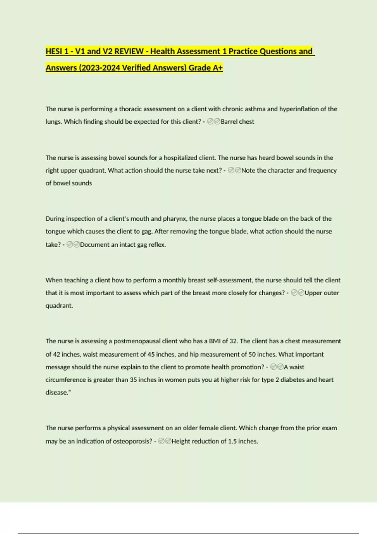 HESI 1 - V1 and V2 REVIEW - Health Assessment 1 Practice Questions and Answers ( Verified Answers) Grade A+.docx