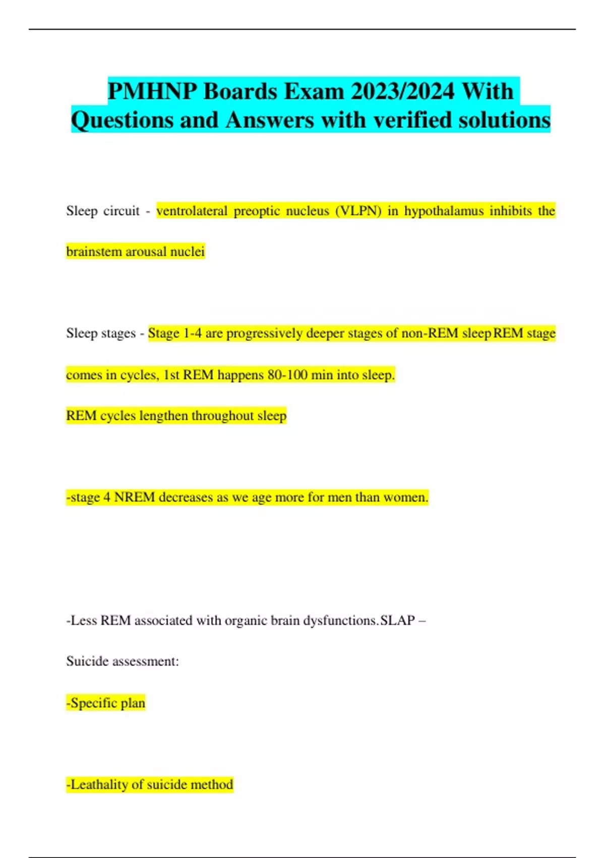 PMHNP Boards Exam 2023/2024 With Questions and Answers with verified solutions Sleep circuit - ventrolateral preoptic nucleus (VLPN) in hypothalamus inhibits the brainstem arousal nuclei Sleep stages - Stage 1-4 are progressively deeper stages of non-REM sleepREM stage comes in cycles, 1st REM happens 80-100 min into sleep. REM cycles lengthen throughout sleep -stage 4 NREM decreases as we age more for men than women. -Less REM associated with organic brain dysfunctions.SLAP – Suicide assessment: -Specific plan