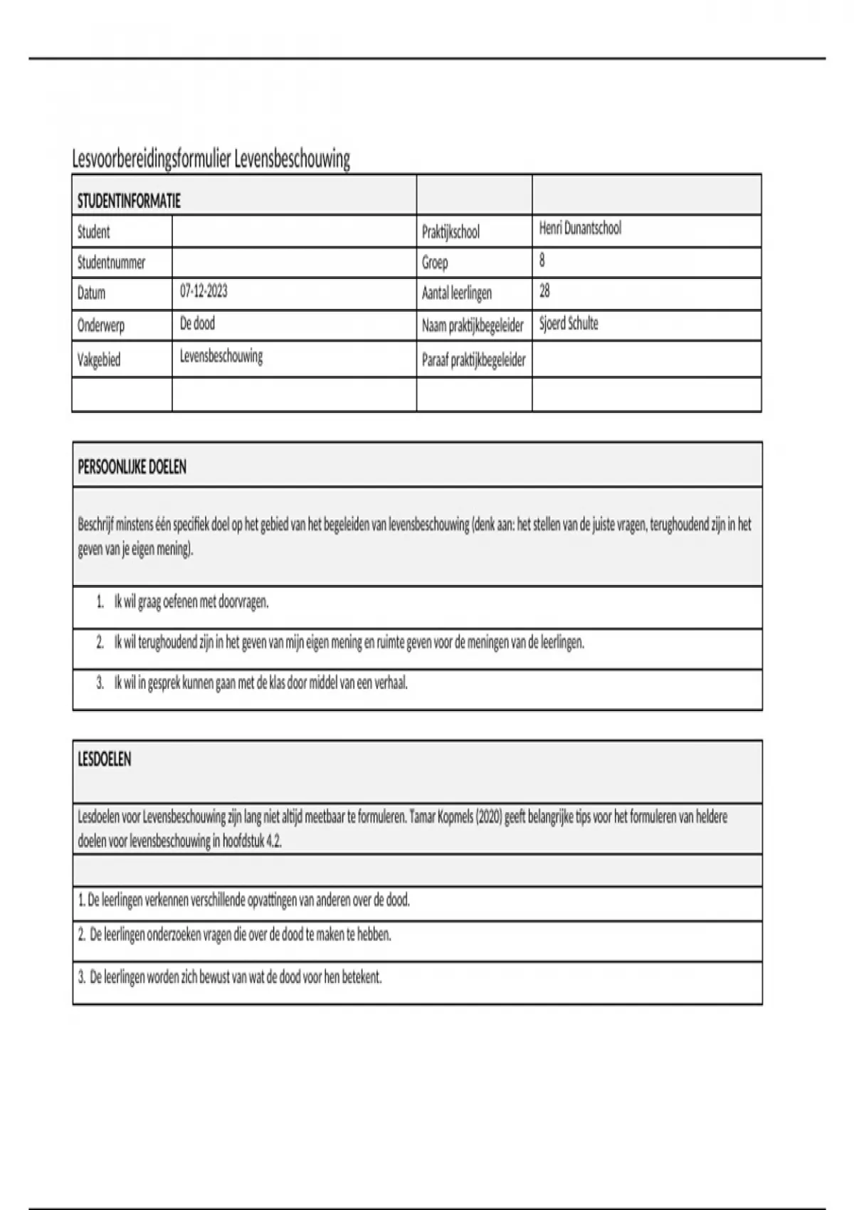 Lesvoorbereidingsformulier Levensbeschouwing