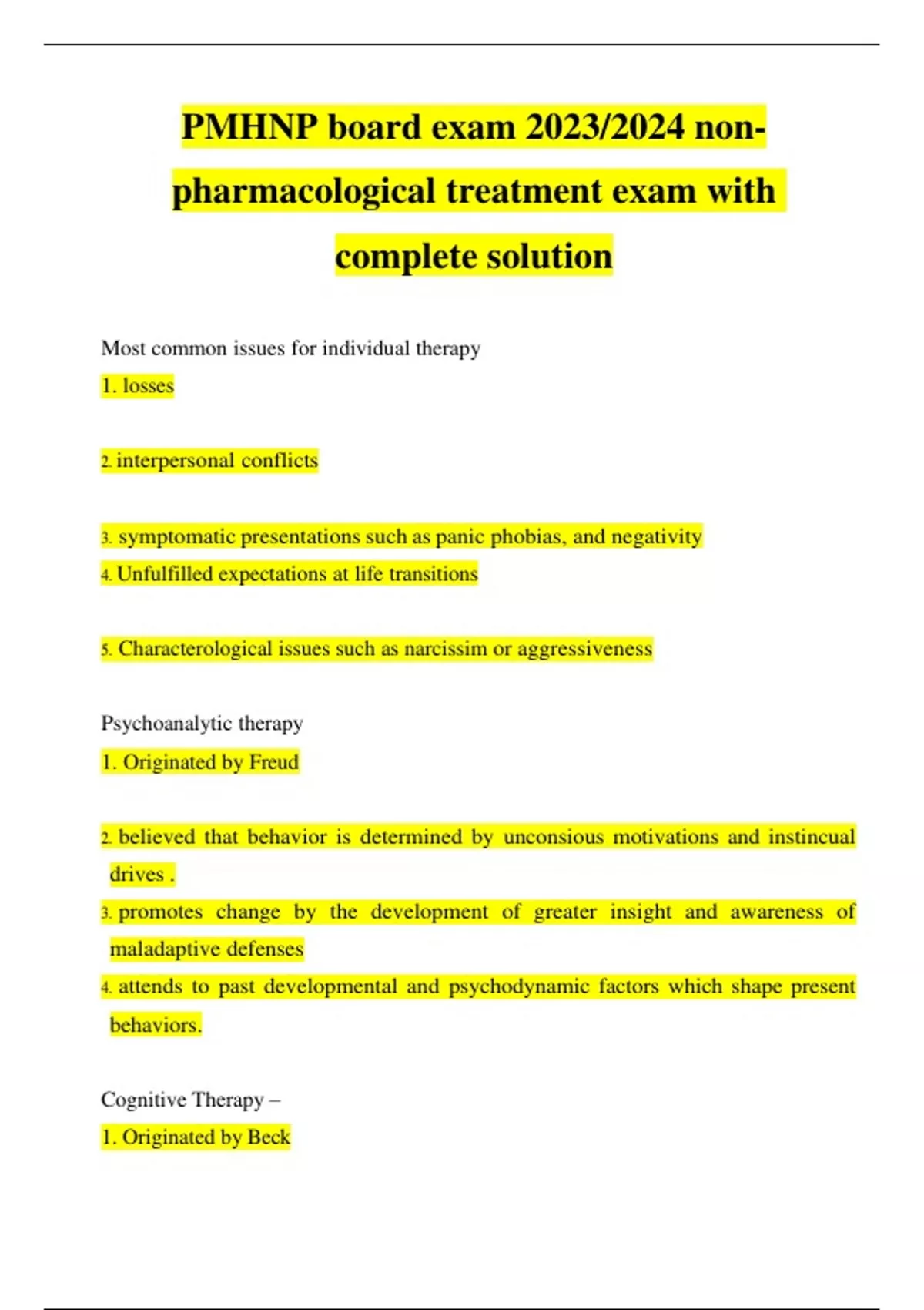 PMHNP board exam 2023/2024 nonpharmacological treatment exam with complete solution Most common issues for individual therapy 1. losses 2. interpersonal conflicts 3. symptomatic presentations such as panic phobias, and negativity 4. Unfulfilled expectations at life transitions 5. Characterological issues such as narcissim or aggressiveness Psychoanalytic therapy 1. Originated by Freud 2. believed that behavior is determined by unconsious motivations and instincual drives . 3. promotes change by the development of greater insight and awareness of maladaptive defenses 4. attends to past developmental and psychodynamic factors which shape present behaviors. Cognitive Therapy – 1. Originated by Beck