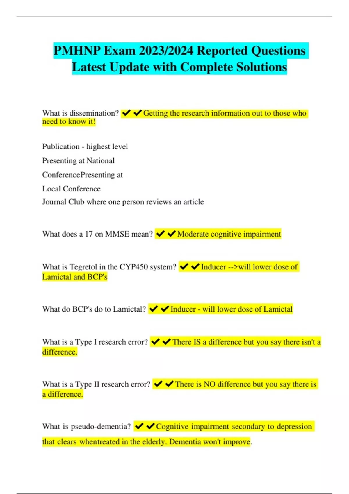 PMHNP Exam 2023/2024 Reported Questions Latest Update with Complete Solutions What is dissemination? Getting the research information out to those who need to know it! Publication - highest level Presenting at National ConferencePresenting at Local Conference Journal Club where one person reviews an article What does a 17 on MMSE mean? Moderate cognitive impairment What is Tegretol in the CYP450 system? Inducer -->will lower dose of Lamictal and BCP's What do BCP's do to Lamictal? Inducer - will lower dose of Lamictal What is a Type I research error? There IS a difference but you say there isn't a difference. What is a Type II research error? There is NO difference but you say there is a difference. What is pseudo-dementia? Cognitive impairment secondary to depression that clears whentreated in the elderly. Dementia won't improve.