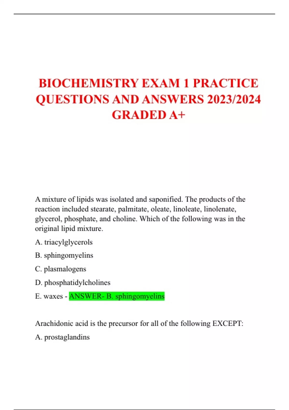 BIOCHEMISTRY EXAM 1 PRACTICE QUESTIONS AND ANSWERS 2023/2024 GRADED A+BIOCHEMISTRY EXAM 1 PRACTICE QUESTIONS AND ANSWERS 2023/2024 GRADED A+BIOCHEMISTRY EXAM 1 PRACTICE QUESTIONS AND ANSWERS 2023/2024 GRADED A+BIOCHEMISTRY EXAM 1 PRACTICE QUESTIONS AND ANSWERS 2023/2024 GRADED A+BIOCHEMISTRY EXAM 1 PRACTICE QUESTIONS AND ANSWERS 2023/2024 GRADED A+