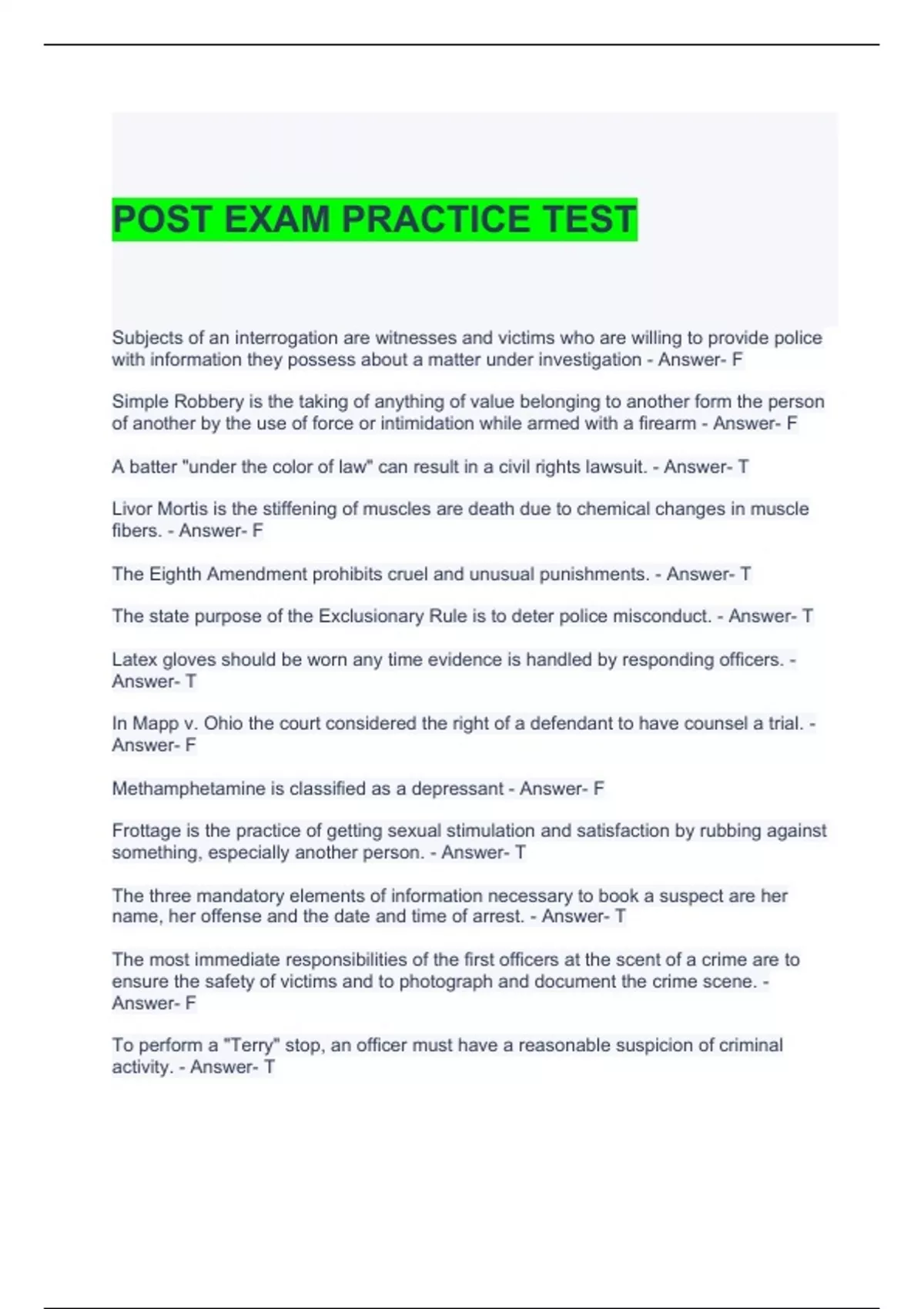 POST EXAM PRACTICE TEST QUESTIONS AND ANSWERS