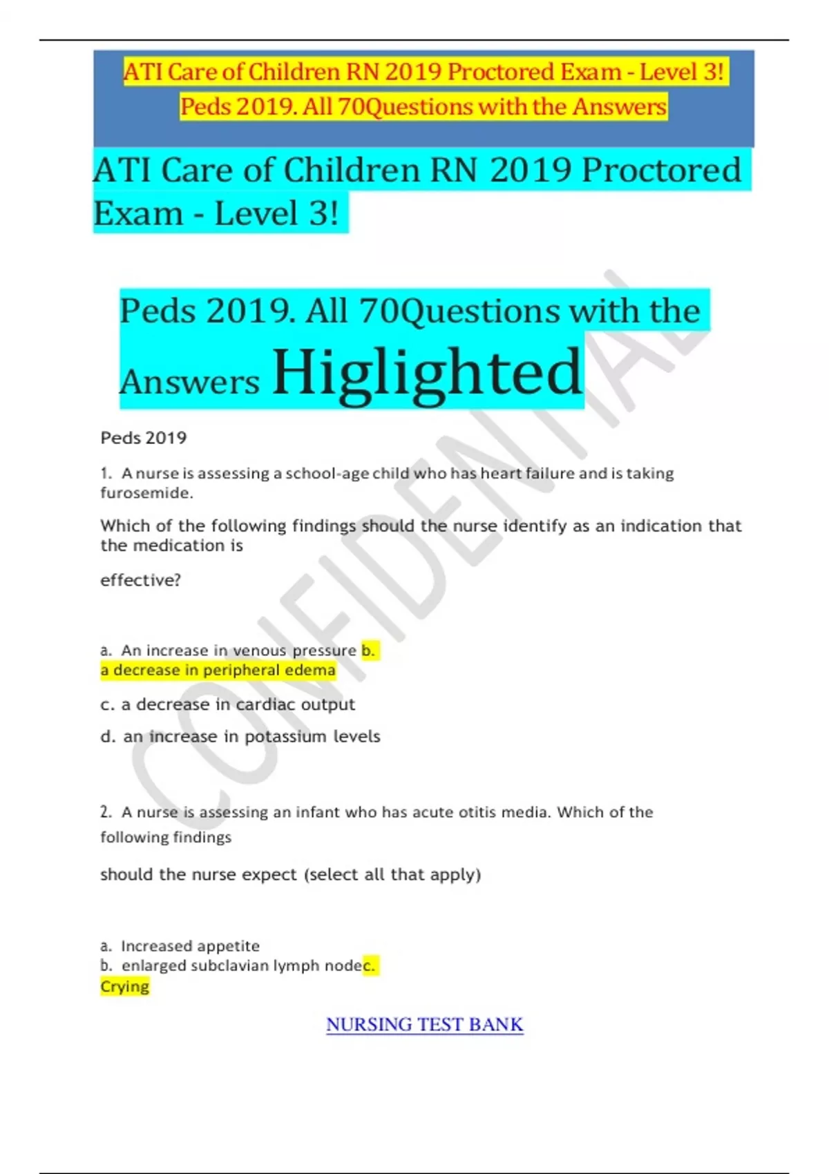 ATI Care of Children RN 2019 Proctored Exam – Level 3 / Peds 2019 All 70 Questions with the Answers Highlighted