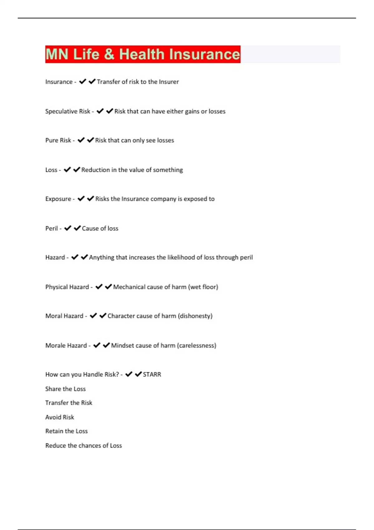 Insurance - Transfer of risk to the Insurer Speculative Risk - Risk that can have either gains or losses Pure Risk - Risk that can only see losses Loss - Reduction in the value of something Exposure - Risks the Insurance company is exposed to Peril - Cause of loss Hazard - Anything that increases the likelihood of loss through peril Physical Hazard - Mechanical cause of harm (wet floor) Moral Hazard - Character cause of harm (dishonesty) Morale Hazard - Mindset cause of harm (carelessness) How can you Handle Risk? - STARR Share the Loss Transfer the Risk Avoid Risk Retain the Loss Reduce the chances of LossElements of Insurable Risk - CANHAM Calculable Affordable Non-Catastrophic Homogenous Accidental Measurable Adverse Selection - People who are high risk are more likely to have insurance Reinsurance - The process of an insurance company sharing the risk they bought Facilitative Reinsurance - Equal share of risk Treaty Reinsurance - Full transfer of risk (must meet certain criteria) Stock Insurance Company - Owned by Shareholders. Dividends go to Shareholders Mutual Insurance Company - Owned by policy holders. Dividends go to policy holders Fraternal Benefit Company - Insurance through membership. Policies are called Certificates. Additional assessable charges could be used if the company doesn't have enough money. NOT FOR PROFIT Reciprocal Insurer - Un-incorperated arrangement where subscribers are assessed the amount they have to pay if a loss to any member occurs. No premiums. Ran by an attorney in factRisk Retention Group - Insurance company created for policyholders from the same industry meant to spread out the risk amongst multiple groups Lloyd's Association - Insurance provided by individual underwriters, which generally focus on specific/unusual risk (arm for a basketball player)