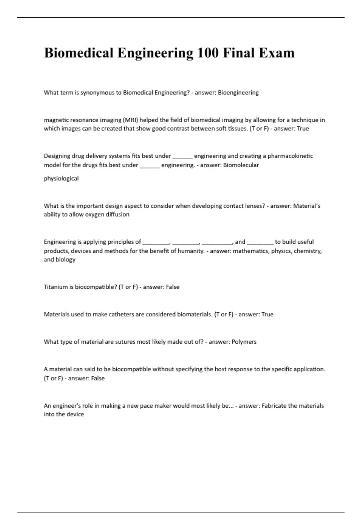 Biomedical Engineering 100 Final Exam with 100% correct answers