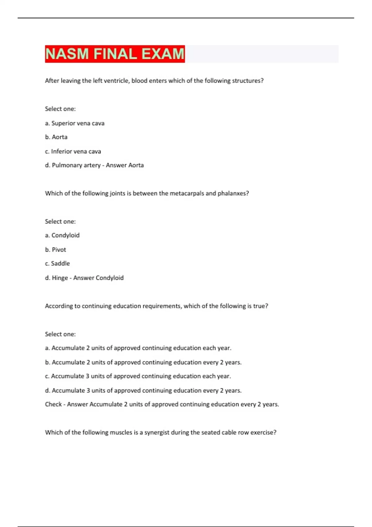 After leaving the left ventricle, blood enters which of the following structures? Select one: a. Superior vena cava b. Aorta c. Inferior vena cava d. Pulmonary artery - Answer Aorta Which of the following joints is between the metacarpals and phalanxes? Select one: a. Condyloid b. Pivot c. Saddle d. Hinge - Answer Condyloid According to continuing education requirements, which of the following is true? Select one: a. Accumulate 2 units of approved continuing education each year. b. Accumulate 2 units of approved continuing education every 2 years. c. Accumulate 3 units of approved continuing education each year. d. Accumulate 3 units of approved continuing education every 2 years. Check - Answer Accumulate 2 units of approved continuing education every 2 years. Which of the following muscles is a synergist during the seated cable row exercise?Select one: a. Latissimus dorsi b. Pectoralis major c. Biceps brachii d. Rotator cuff - Answer Biceps brachii The autonomic nervous system contains which of the following subdivisions? Select one: a. Sympathetic b. Somatic c. Peripheral d. Central - Answer Sympathetic