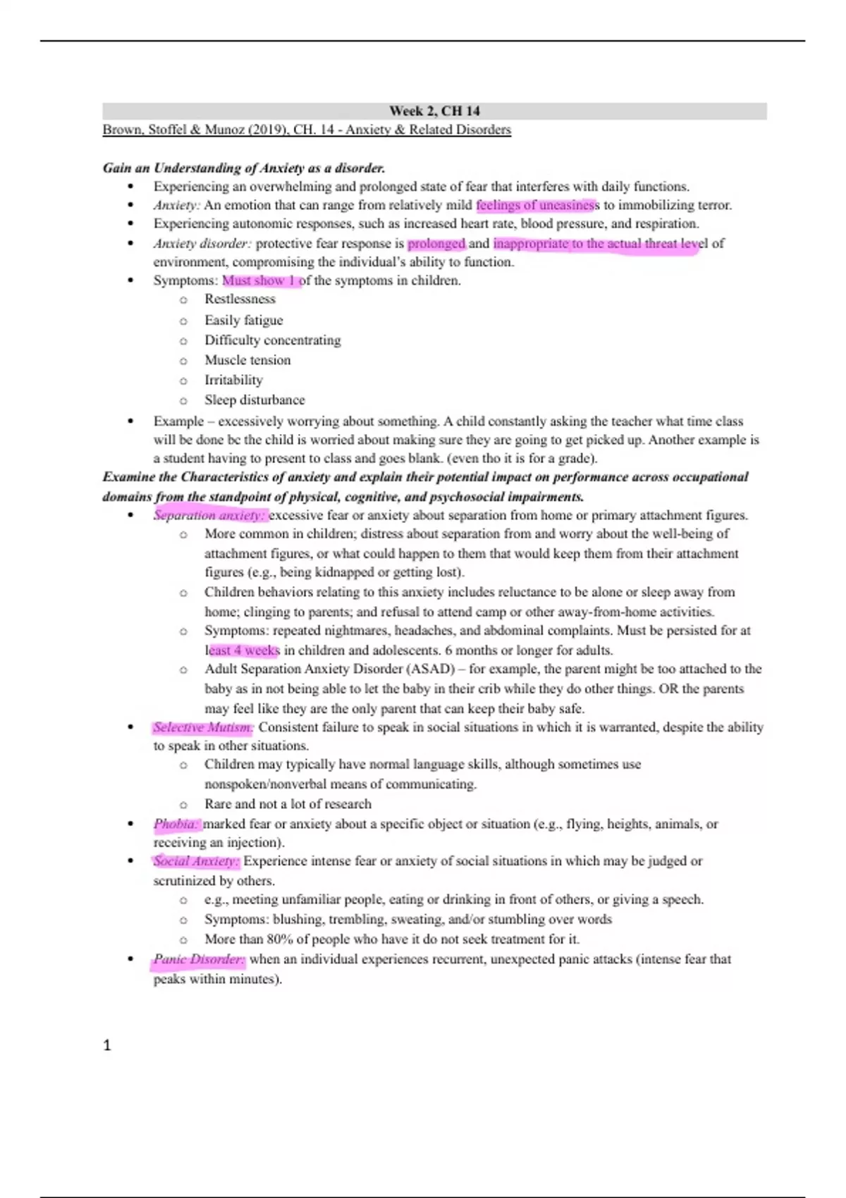 This class note describes chapter 14, anxiety and related disorders. It includes etiology, courses, prevalence, and comorbidity and describes all of the disorders related to anxiety.