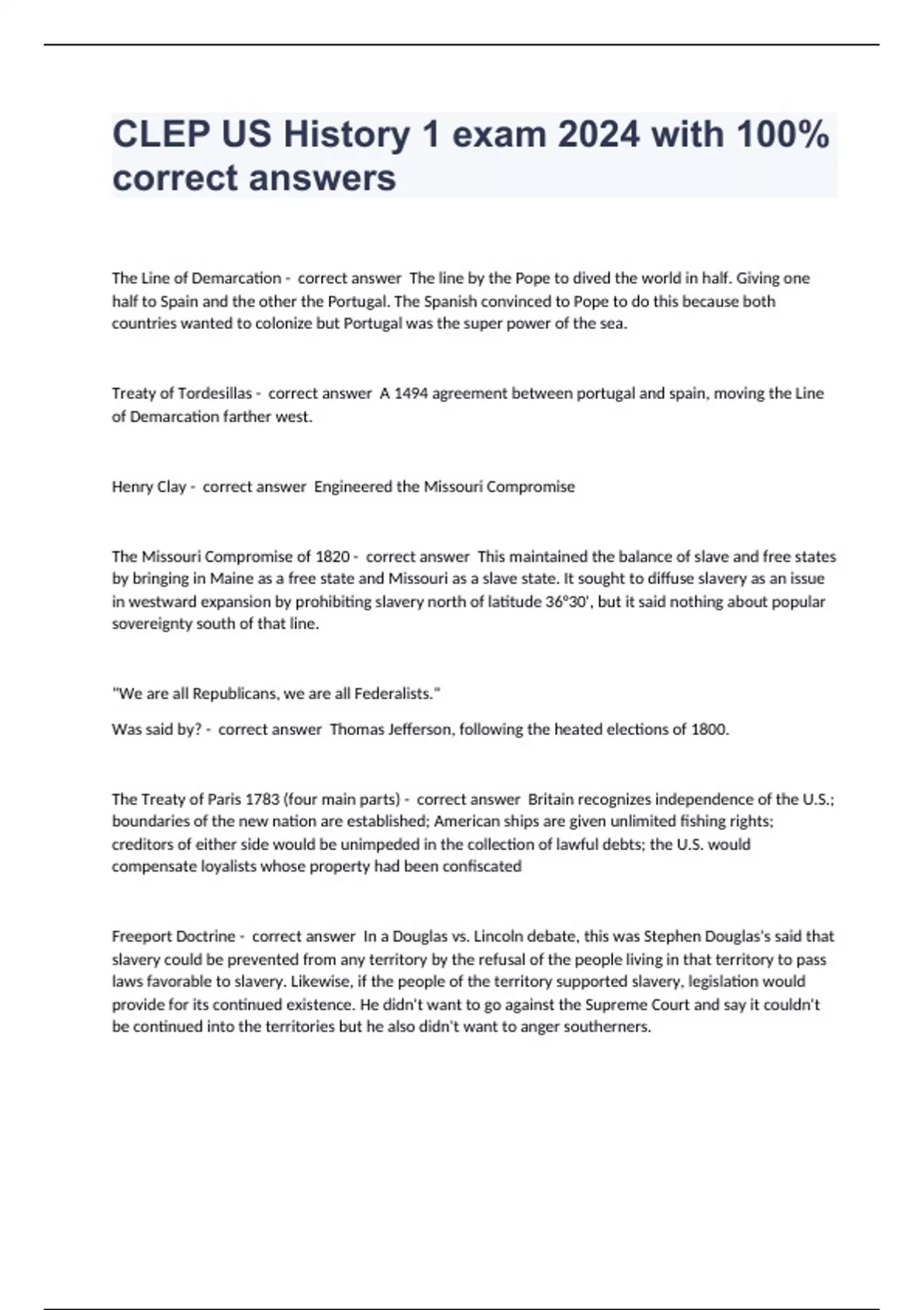 The Line of Demarcation - correct answer The line by the Pope to dived the world in half. Giving one half to Spain and the other the Portugal. The Spanish convinced to Pope to do this because both countries wanted to colonize but Portugal was the super power of the sea. Treaty of Tordesillas - correct answer A 1494 agreement between portugal and spain, moving the Line of Demarcation farther west. Henry Clay - correct answer Engineered the Missouri Compromise The Missouri Compromise of 1820 - correct answer This maintained the balance of slave and free states by bringing in Maine as a free state and Missouri as a slave state. It sought to diffuse slavery as an issue in westward expansion by prohibiting slavery north of latitude 36°30', but it said nothing about popular sovereignty south of that line. "We are all Republicans, we are all Federalists." Was said by? - correct answer Thomas Jefferson, following the heated elections of 1800. The Treaty of Paris 1783 (four main parts) - correct answer Britain recognizes independence of the U.S.; boundaries of the new nation are established; American ships are given unlimited fishing rights; creditors of either side would be unimpeded in the collection of lawful debts; the U.S. would compensate loyalists whose property had been confiscated Freeport Doctrine - correct answer In a Douglas vs. Lincoln debate, this was Stephen Douglas's said that slavery could be prevented from any territory by the refusal of the people living in that territory to pass laws favorable to slavery. Likewise, if the people of the territory supported slavery, legislation would provide for its continued existence. He didn't want to go against the Supreme Court and say it couldn't be continued into the territories but he also didn't want to anger southerners.