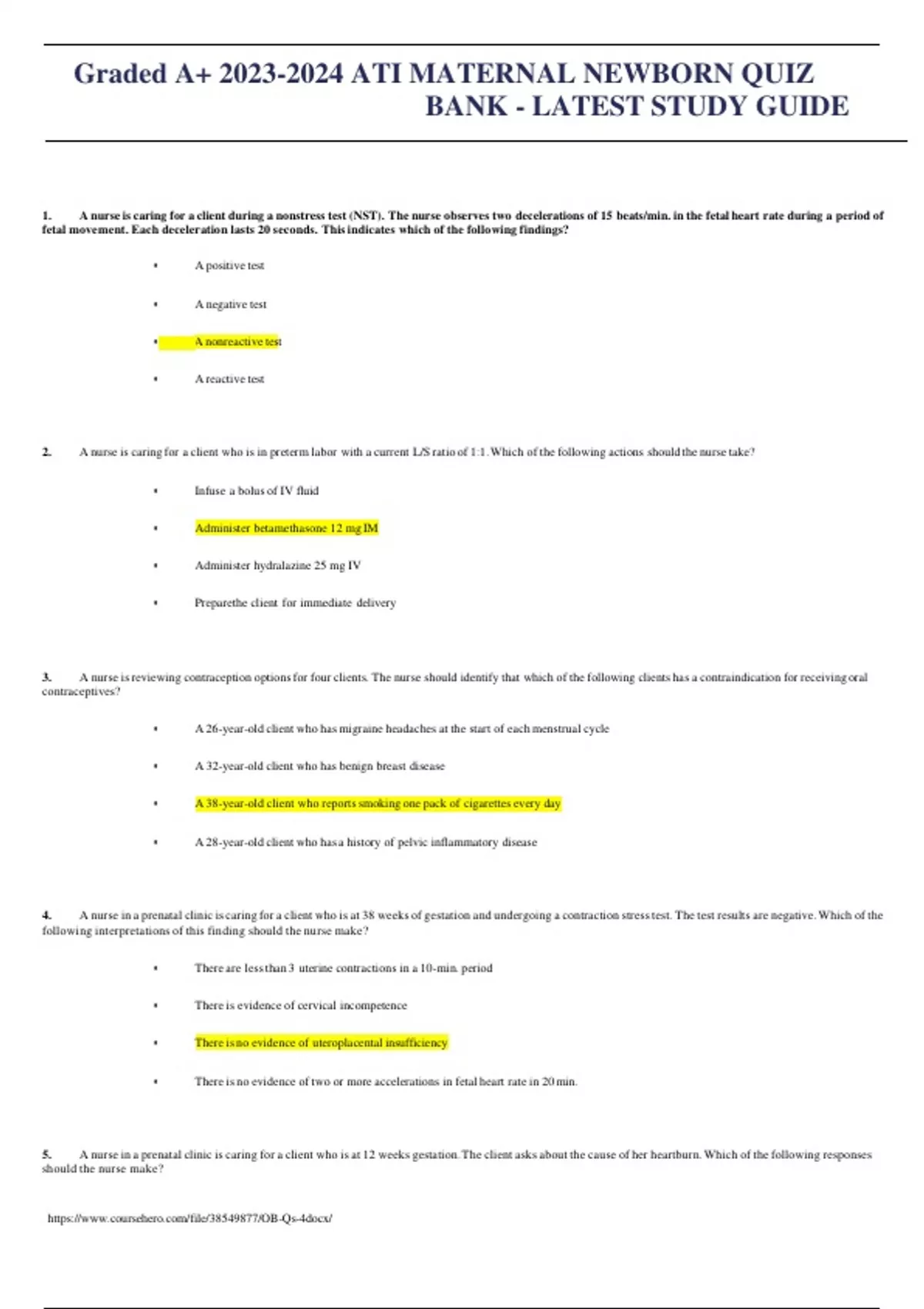 Graded A+ ATI MATERNAL NEWBORN QUIZ BANK - LATEST STUDY GUIDE 100%Complete Verified answerd 1. A nurse is caring for a client during a nonstress test (NST). The nurse observes two decelerations of 15 beats/min. in the fetal heart rate during a period of fetal movement. Each deceleration lasts 20 seconds. Thisindicates which of the following findings? • A positive test • A negative test • A nonreactive test • A reactive test 2. A nurse is caring for a client who is in preterm labor with a current L/S ratio of 1:1.Which of the following actions should the nurse take? • Infuse a bolus of IV fluid • Administer betamethasone 12 mg IM • Administer hydralazine 25 mg IV • Preparethe client for immediate delivery 3. A nurse isreviewing contraception optionsfor four clients. The nurse should identify that which of the following clients has a contraindication for receiving oral contraceptives? • A 26-year-old client who has migraine headaches at the start of each menstrual cycle • A 32-year-old client who has benign breast disease • A 38-year-old client who reportssmoking one pack of cigarettes every day • A 28-year-old client who has a history of pelvic inflammatory disease 4. A nurse in a prenatal clinic is caring for a client who is at 38 weeks of gestation and undergoing a contraction stresstest. The test results are negative.Which of the following interpretations of this finding should the nurse make? • There are lessthan 3 uterine contractions in a 10-min. period • There is evidence of cervical incompetence • There is no evidence of uteroplacental insufficiency • There is no evidence of two or more accelerations in fetal heart rate in 20 min. 5. A nurse in a prenatal clinic is caring for a client who is at 12 weeks gestation.The client asks about the cause of her heartburn.Which of the following responses should the nurse make? Graded A+ ATI MATERNAL NEWBORN QUIZ BANK - LATEST STUDY GUIDE 100%Complete Verified answerd • Increase estrogen production causesincreased secretion of hydrochloric acid • Retained bile in the liver resultsin delayed digestion This study source was downloaded by from CourseH on :27:46 GMT -05:00 • Increased progesterone production causes decreased motility of smooth muscle ATI MATERNAL NEWBORN QUIZ BANK - LATEST STUDY GUIDE • Pressure from the growing uterus displacesthe stomach 6. A nurse on theobstetric unit is caring for a client who experienced abruptio placentae.The nurse observes petechiae and bleeding around the IV access site. The nurse should recognize that this client is at risk for which ofthe following complications? • Puerperal infection • Anaphylactoid syndrome of pregnancy • Disseminated intravascular coagulation • Preeclampsia 7. A nurse in a prenatal clinic isteachinga client who is in her second trimester and has a new diagnosis of gestational diabetes. Which of the following statements by the client indicates a need for further teaching? • “I will reduce my exercise schedule to 3 days a week.” • “I will takemy glyburide daily with breakfast.” • “I knowI am at increased risk to develop ty
