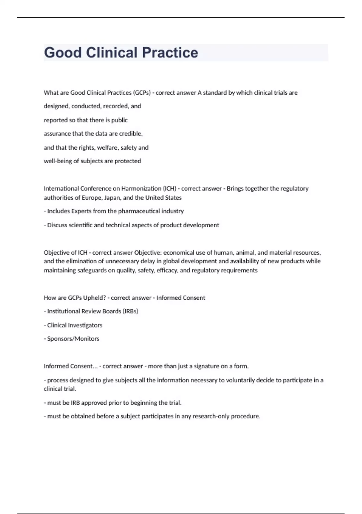 Good Clinical Practice Questions with complete solution 2023/2024What are Good Clinical Practices (GCPs) - correct answer A standard by which clinical trials are designed, conducted, recorded, and reported so that there is public assurance that the data are credible, and that the rights, welfare, safety and well-being of subjects are protected International Conference on Harmonization (ICH) - correct answer - Brings together the regulatory authorities of Europe, Japan, and the United States - Includes Experts from the pharmaceutical industry - Discuss scientific and technical aspects of product development