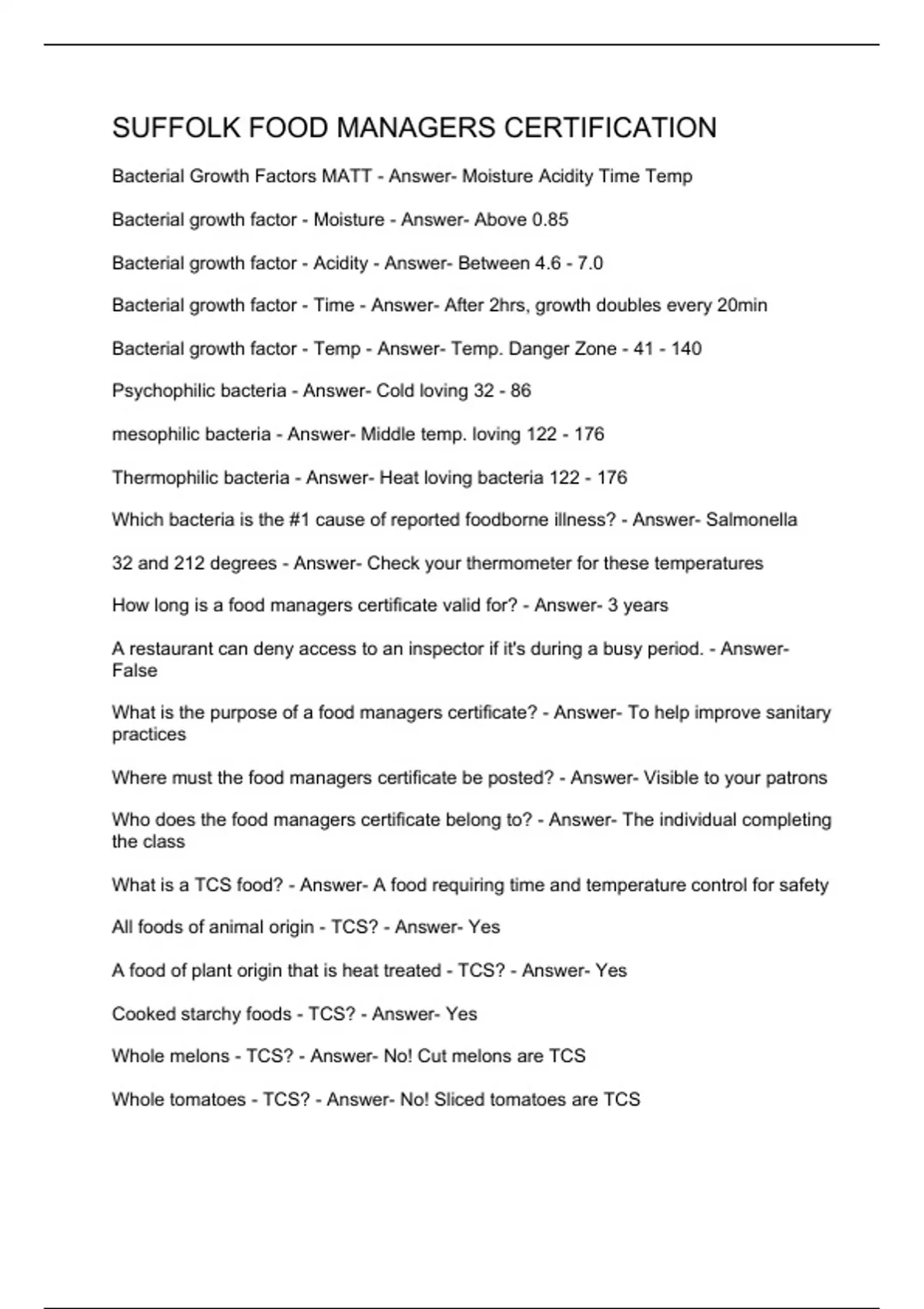 Bacterial Growth Factors MATT - Answer- Moisture Acidity Time Temp Bacterial growth factor - Moisture - Answer- Above 0.85 Bacterial growth factor - Acidity - Answer- Between 4.6 - 7.0 Bacterial growth factor - Time - Answer- After 2hrs, growth doubles every 20min Bacterial growth factor - Temp - Answer- Temp. Danger Zone - 41 - 140 Psychophilic bacteria - Answer- Cold loving 32 - 86 mesophilic bacteria - Answer- Middle temp. loving 122 - 176 Thermophilic bacteria - Answer- Heat loving bacteria 122 - 176 Which bacteria is the #1 cause of reported foodborne illness? - Answer- Salmonella 32 and 212 degrees - Answer- Check your thermometer for these temperatures How long is a food managers certificate valid for? - Answer- 3 years A restaurant can deny access to an inspector if it's during a busy period. - Answer- False What is the purpose of a food managers certificate? - Answer- To help improve sanitary practices Where must the food managers certificate be posted? - Answer- Visible to your patrons Who does the food managers certificate belong to? - Answer- The individual completing the class What is a TCS food? - Answer- A food requiring time and temperature control for safety All foods of animal origin - TCS? - Answer- Yes A food of plant origin that is heat treated - TCS? - Answer- Yes Cooked starchy foods - TCS? - Answer- Yes Whole melons - TCS? - Answer- No! Cut melons are TCS Whole