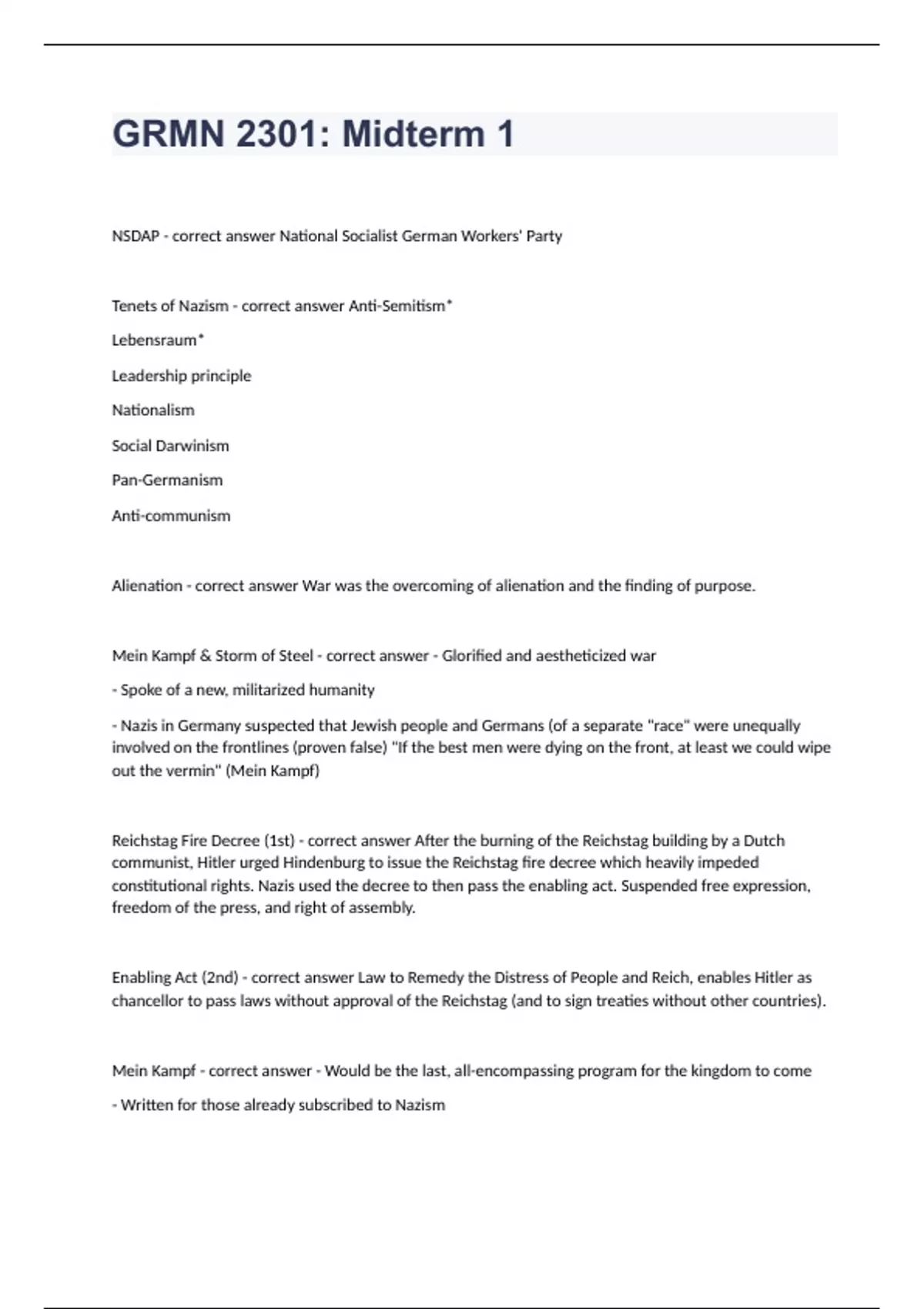 GRMN 2301 Midterm 1 Question and answers correctly solved 2023/2024NSDAP - correct answer National Socialist German Workers' Party Tenets of Nazism - correct answer Anti-Semitism* Lebensraum* Leadership principle Nationalism Social Darwinism Pan-Germanis