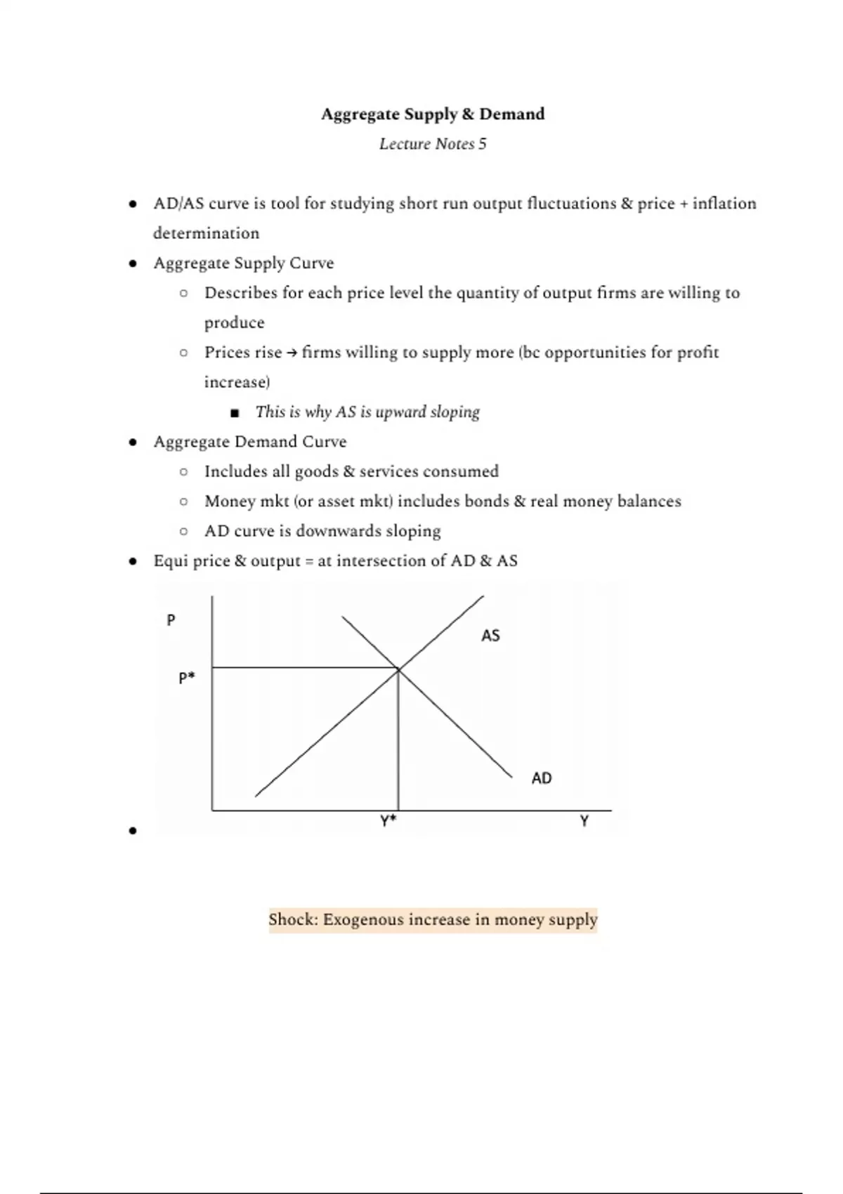 This is an organized and concise summary of Macroeconomics Lecture Notes 5: Aggregate Supply (AS) and Aggregate Demand (AD). It includes descriptions of the AS and AD curves, their graphs, and how shocks affect economies based on the intersection of supply & demand. Classical Long Run and Keynesian Short Run situations are explained and analyzed, as is the Quantity Theory of Money in relation to the AD curve, Supply-Side policy, and the Laffer Curve.