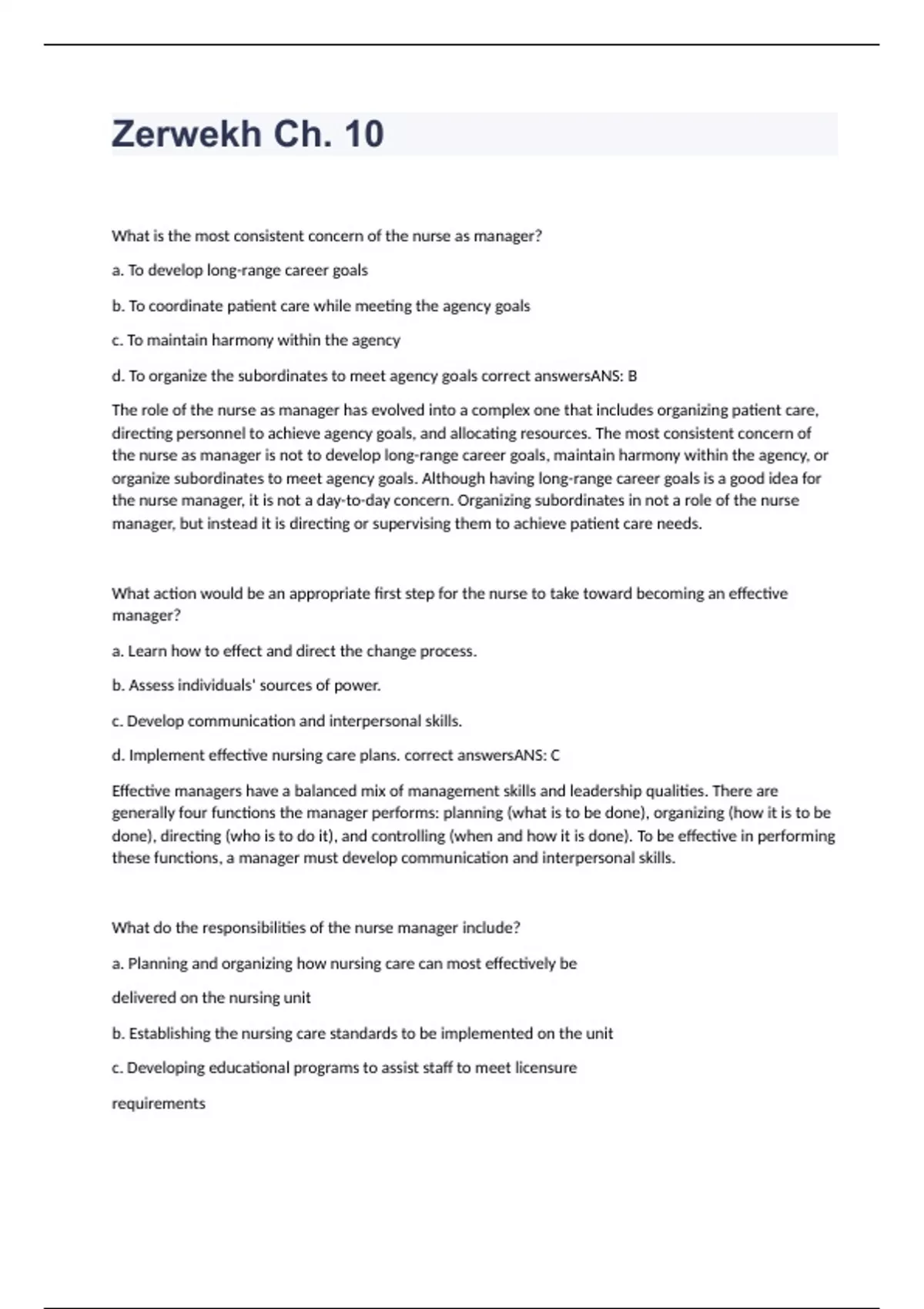 What is the most consistent concern of the nurse as manager? a. To develop long-range career goals b. To coordinate patient care while meeting the agency goals c. To maintain harmony within the agency d. To organize the subordinates to meet agency goals correct answersANS: B The role of the nurse as manager has evolved into a complex one that includes organizing patient care, directing personnel to achieve agency goals, and allocating resources. The most consistent concern of the nurse as manager is not to develop long-range career goals, maintain harmony within the agency, or organize subordinates to meet agency goals. Although having long-range career goals is a good idea for the nurse manager, it is not a day-to-day concern. Organizing subordinates in not a role of the nurse manager, but instead it is directing or supervising them to achieve patient care needs. What action would be an appropriate first step for the nurse to take toward becoming an effective manager? a. Learn how to effect and direct the change process. b. Assess individuals' sources of power. c. Develop communication and interpersonal skills. d. Implement effective nursing care plans. correct answersANS: C Effective managers have a balanced mix of management skills and leadership qualities. There are generally four functions the manager performs: planning (what is to be done), organizing (how it is to be done), directing (who is to do it), and controlling (when and how it is done). To be effective in performing these functions, a manager must develop communication and interpersonal skills. What do the responsibilities of the nurse manager include? a. Planning and organizing how nursing care can most effectively be delivered on the nursing unit b. Establishing the nursing care standards to be implemented on the unit c. Developing educational programs to assist staff to meet licensure requirements