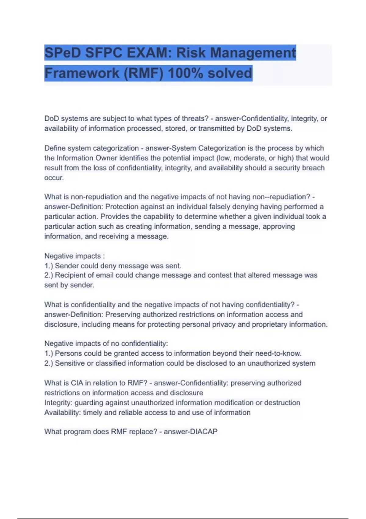 SPeD SFPC EXAM: Risk Management Framework (RMF) 100% solved
