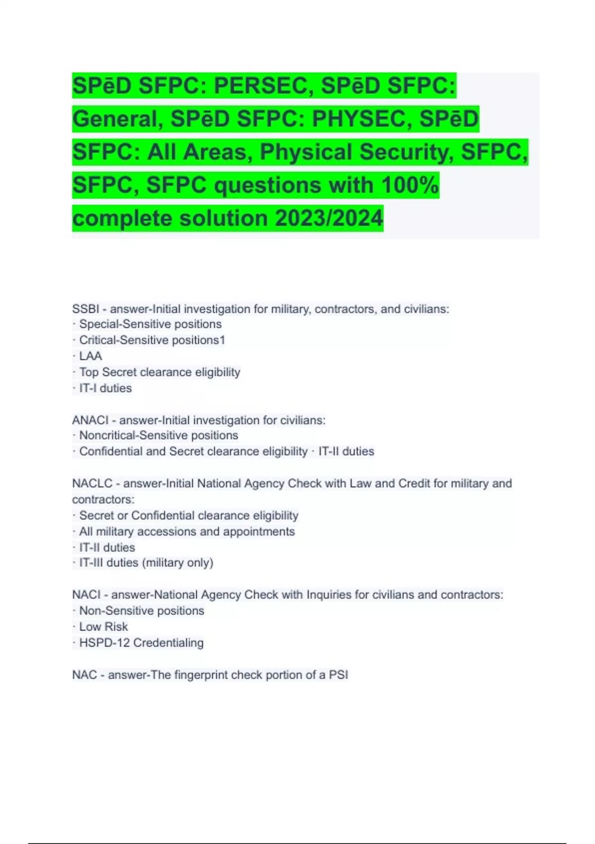 SPēD SFPC: PERSEC, SPēD SFPC: General, SPēD SFPC: PHYSEC, SPēD SFPC: All Areas, Physical Security, SFPC, SFPC, SFPC questions with 100% complete solution 2023/2024