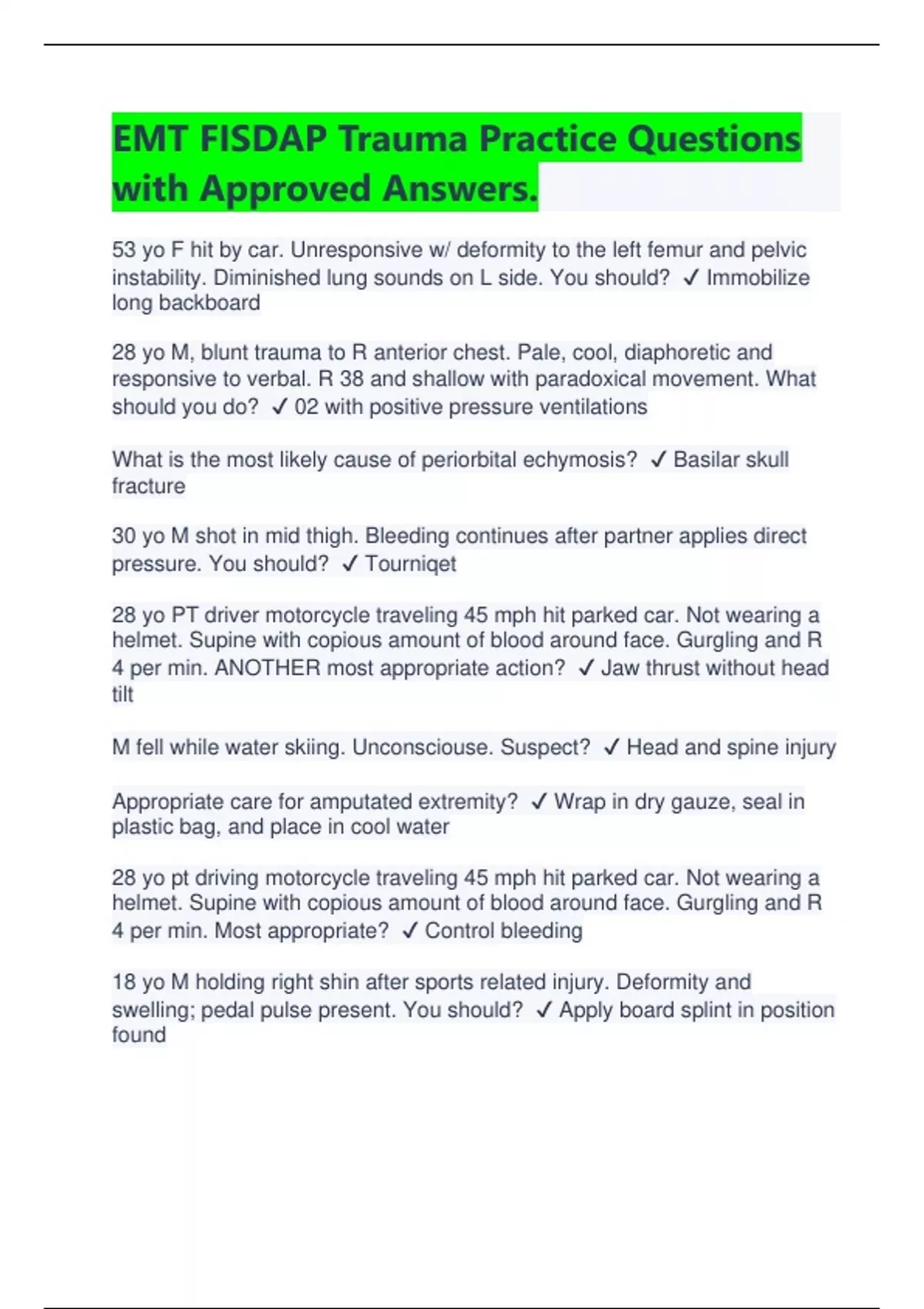 EMT FISDAP Trauma Practice Questions with Approved Answers. | Latest 2024/2025