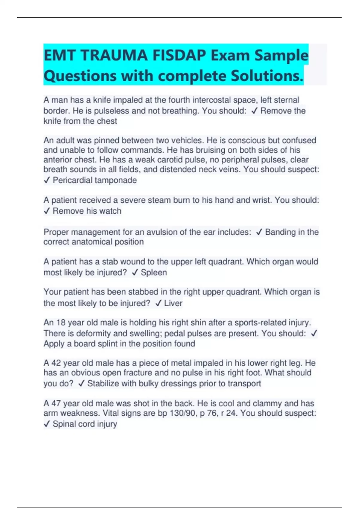 EMT TRAUMA FISDAP Exam Sample Questions with complete Solutions | Latest 2024/2025