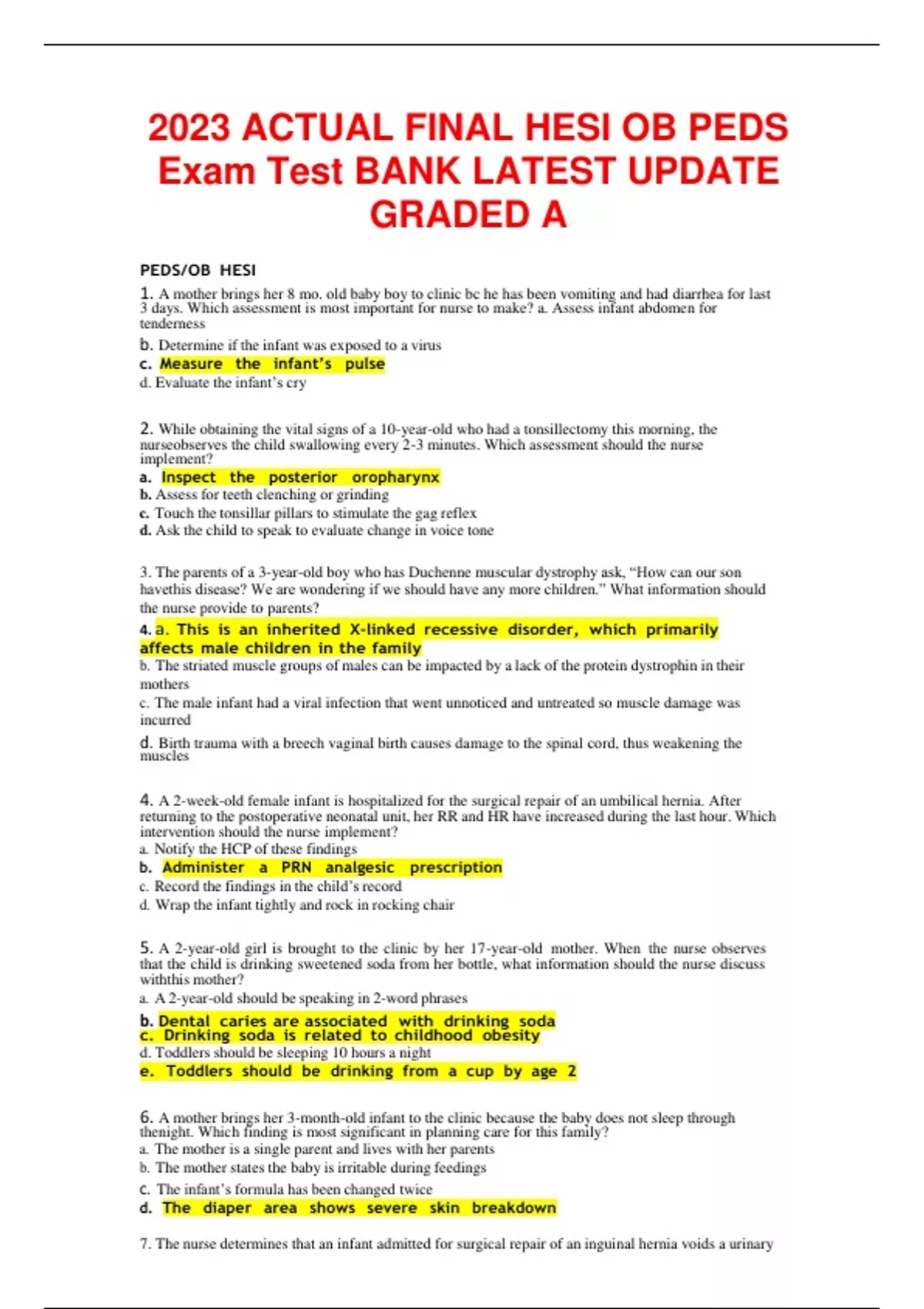 2023 ACTUAL FINAL HESI OB PEDS Exam Test BANK LATEST UPDATE GRADED A PEDS/OB HESI 1. A mother brings her 8 mo. old baby boy to clinic bc he has been vomiting and had diarrhea for last 3 days. Which assessment is most important for nurse to make? a. Assess infant abdomen for tenderness b. Determine if the infant was exposed to a virus c. Measure the infant’s pulse d. Evaluate the infant’s cry 2. While obtaining the vital signs of a 10-year-old who had a tonsillectomy this morning, the nurseobserves the child swallowing every 2-3 minutes. Which assessment should the nurse implement? a. Inspect the posterior oropharynx b. Assess for teeth clenching or grinding c. Touch the tonsillar pillars to stimulate the gag reflex d. Ask the child to speak to evaluate change in voice tone 3. The parents of a 3-year-old boy who has Duchenne muscular dystrophy ask, “How can our son havethis disease? We are wondering if we should have any more children.” What information should the nurse provide to parents? 4. a. This is an inherited X-linked recessive disorder, which primarily affects male children in the family b. The striated muscle groups of males can be impacted by a lack of the protein dystrophin in their mothers c. The male infant had a viral infection that went unnoticed and untreated so muscle damage was incurred d. Birth trauma with a breech vaginal birth causes damage to the spinal cord, thus weakening the muscles 4. A 2-week-old female infant is hospitalized for the surgical repair of an umbilical hernia. After returning to the postoperative neonatal unit, her RR and HR have increased during the last hour. Which intervention should the nurse implement? a. Notify the HCP of these findings b. Administer a PRN analgesic prescription c. Record the findings in the child’s record d. Wrap the infant tightly and rock in rocking chair 5. A 2-year-old girl is brought to the clinic by her 17-year-old mother. When the nurse observes that the child is drinking sweetened soda from her bottle, what information should the nurse discuss withthis mother? a. A 2-year-old should be speaking in 2-word phrases b. Dental caries are associated with drinking soda c. Drinking soda is related to childhood obesity d. Toddlers should be sleeping 10 hours a night e. Toddlers should be drinking from a cup by age 2 6. A mother brings her 3-month-old infant to the clinic because the baby does not sleep through thenight. Which finding is most significant in planning care for this family? a. The mother is a single parent and lives with her parents b. The mother states the baby is irritable during feedings c. The infant’s formula has been changed twice d. The diaper area shows severe skin breakdown 7. The nurse determines that an infant admitted for surgical repair of an inguinal hernia voids a urinary stream from the ventral surface of the penis. What action should the nurse take? a. Document the finding b. Palpate scrotum for testicular descen