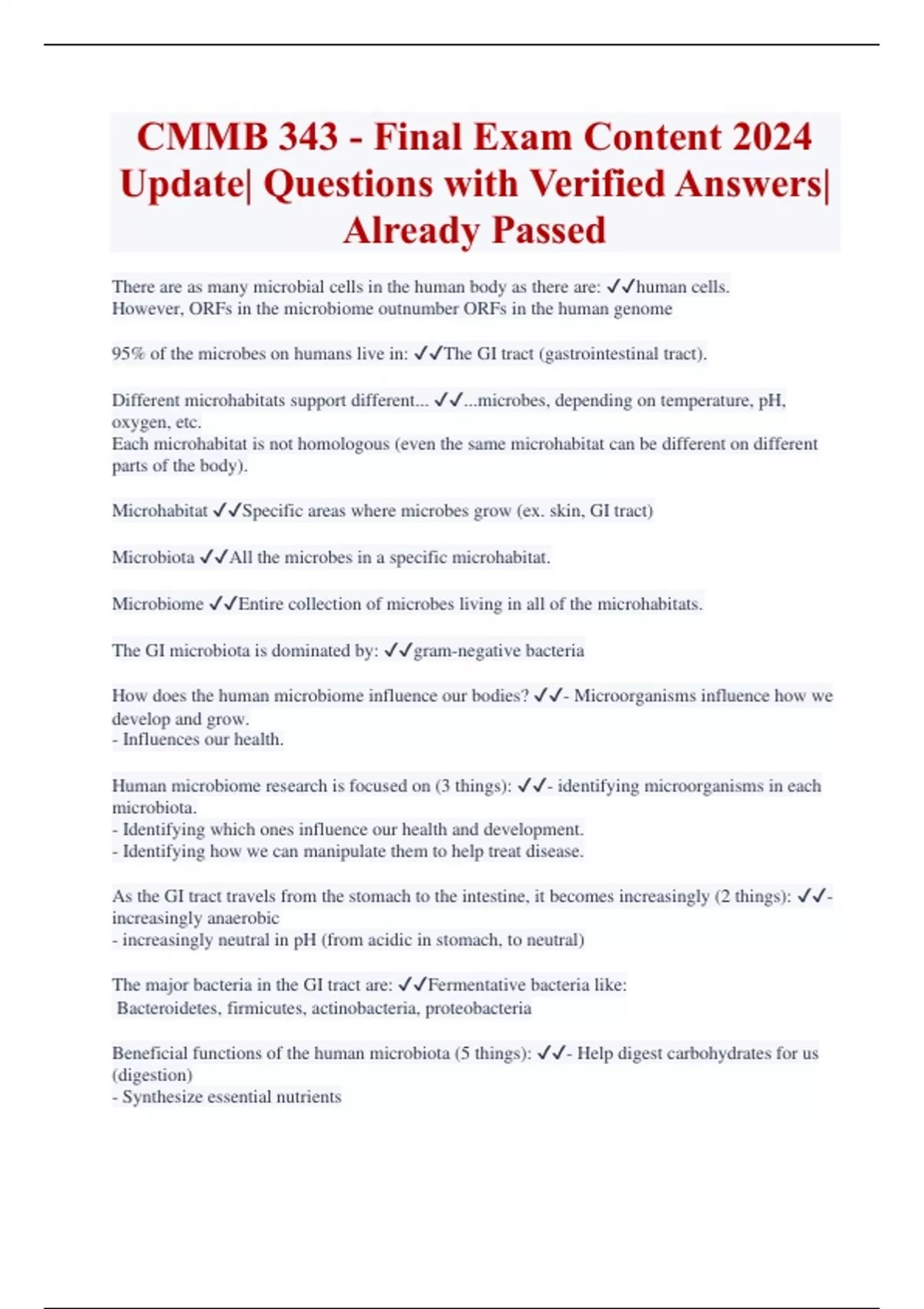 CMMB 343 - Final Exam Content 2024 Update| Questions with Verified Answers| Already Passed There are as many microbial cells in the human body as there are: human cells. However, ORFs in the microbiome outnumber ORFs in the human genome 95% of the microbes on humans live in: The GI tract (gastrointestinal tract). Different microhabitats support different... ...microbes, depending on temperature, pH, oxygen, etc. Each microhabitat is not homologous (even the same microhabitat can be different on different parts of the body). Microhabitat Specific areas where microbes grow (ex. skin, GI tract) Microbiota All the microbes in a specific microhabitat. Microbiome Entire collection of microbes living in all of the microhabitats. The GI microbiota is dominated by: gram-negative bacteria How does the human microbiome influence our bodies? - Microorganisms influence how we develop and grow. - Influences our health.