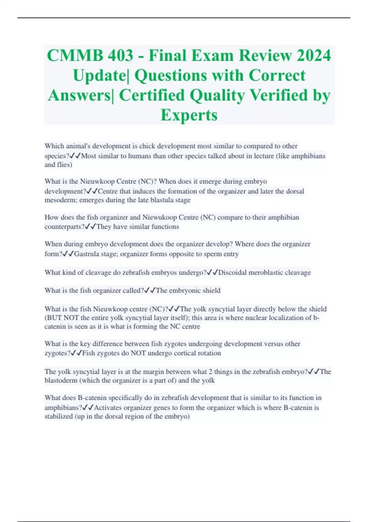 CMMB 403 - Final Exam Review 2024 Update| Questions with Correct Answers| Certified Quality Verified by Experts Which animal's development is chick development most similar to compared to other species?Most similar to humans than other species talked about in lecture (like amphibians and flies) What is the Nieuwkoop Centre (NC)? When does it emerge during embryo development?Centre that induces the formation of the organizer and later the dorsal mesoderm; emerges during the late blastula stage How does the fish organizer and Niewukoop Centre (NC) compare to their amphibian counterparts?They have similar functions When during embryo development does the organizer develop? Where does the organizer form?Gastrula stage; organizer forms opposite to sperm entry What kind of cleavage do zebrafish embryos undergo?Discoidal meroblastic cleavage What is the fish organizer called?The embryonic shield