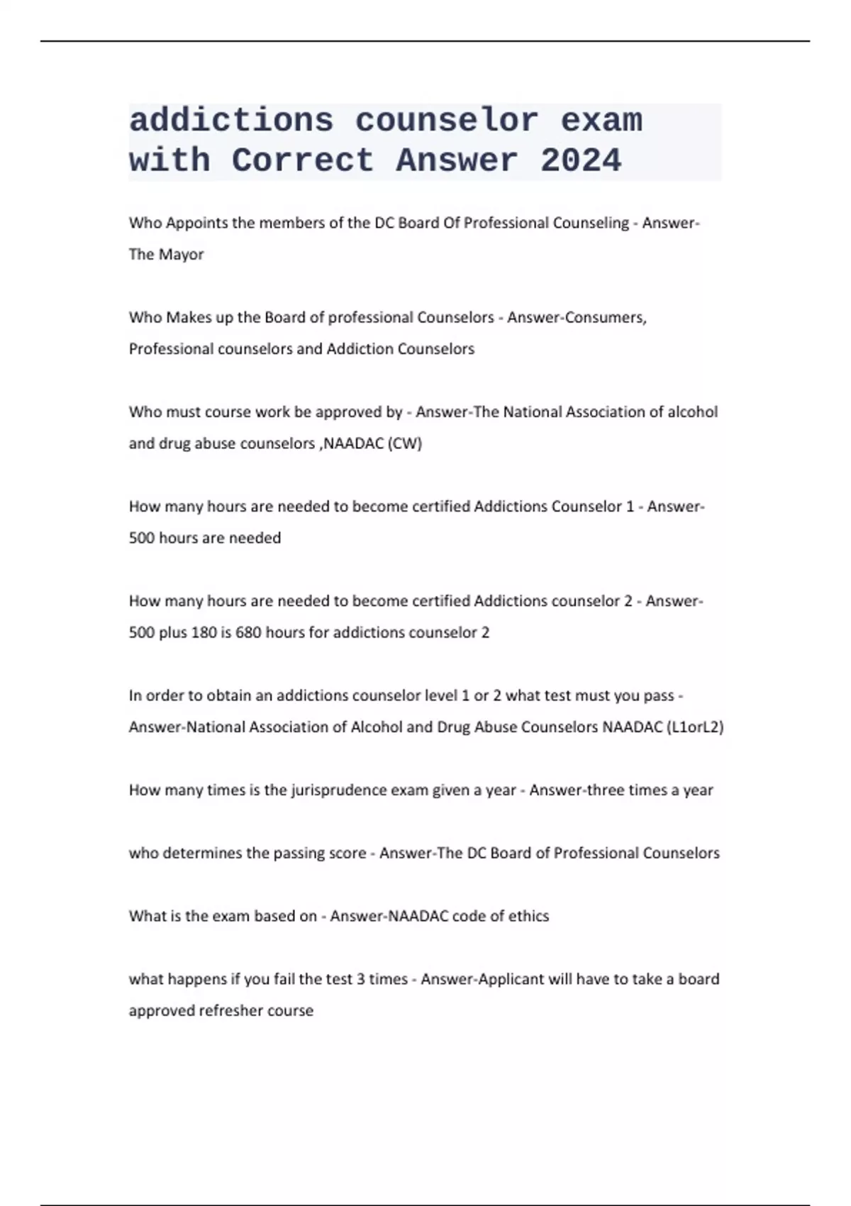 Who Appoints the members of the DC Board Of Professional Counseling - Answer- The Mayor Who Makes up the Board of professional Counselors - Answer-Consumers, Professional counselors and Addiction Counselors Who must course work be approved by - Answer-The National Association of alcohol and drug abuse counselors ,NAADAC (CW) How many hours are needed to become certified Addictions Counselor 1 - Answer- 500 hours are needed How many hours are needed to become certified Addictions counselor 2 - Answer- 500 plus 180 is 680 hours for addictions counselor 2 In order to obtain an addictions counselor level 1 or 2 what test must you pass - Answer-National Association of Alcohol and Drug Abuse Counselors NAADAC (L1orL2) How many times is the jurisprudence exam given a year - Answer-three times a year who determines the passing score - Answer-The DC Board of Professional Counselors What is the exam based on - Answer-NAADAC code of ethics what happens if you fail the test 3 times - Answer-Applicant will have to take a board approved refresher course