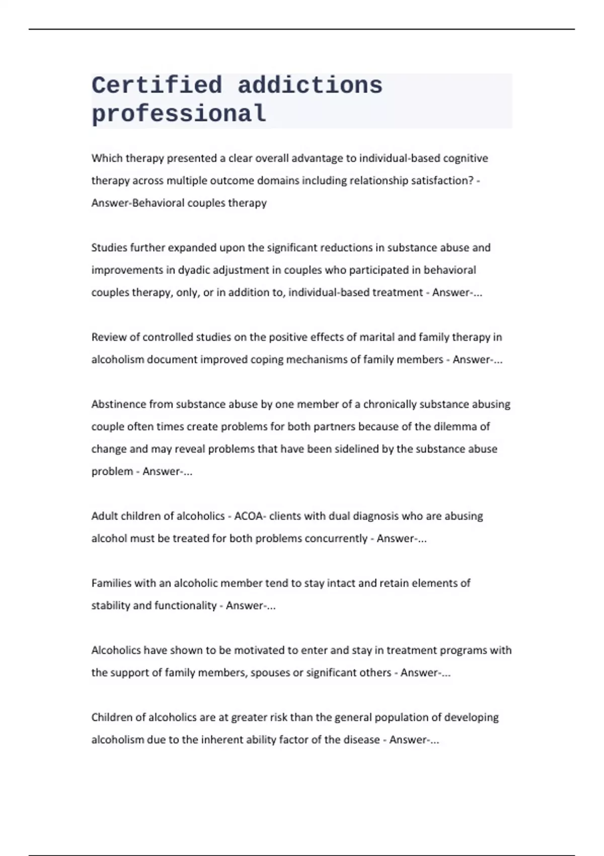 Which therapy presented a clear overall advantage to individual-based cognitive therapy across multiple outcome domains including relationship satisfaction? - Answer-Behavioral couples therapy Studies further expanded upon the significant reductions in substance abuse and improvements in dyadic adjustment in couples who participated in behavioral couples therapy, only, or in addition to, individual-based treatment - Answer-... Review of controlled studies on the positive effects of marital and family therapy in alcoholism document improved coping mechanisms of family members - Answer-... Abstinence from substance abuse by one member of a chronically substance abusing couple often times create problems for both partners because of the dilemma of change and may reveal problems that have been sidelined by the substance abuse problem - Answer-... Adult children of alcoholics - ACOA- clients with dual diagnosis who are abusing alcohol must be treated for both problems concurrently - Answer-... Families with an alcoholic member tend to stay intact and retain elements of stability and functionality - Answer-... Alcoholics have shown to be motivated to enter and stay in treatment programs with the support of family members, spouses or significant others - Answer-... Children of alcoholics are at greater risk than the general population of developing alcoholism due to the inherent ability factor of the disease - Answer-... Stephen Wolin describes the relationship adult children of alcoholics, who of them selves are not alcoholics, have resilient relationships with their families of origin -