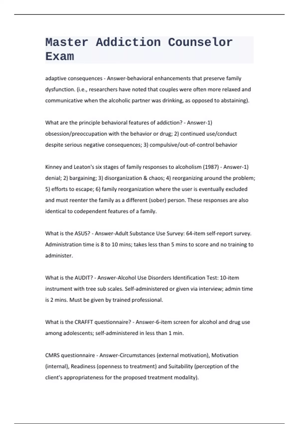 adaptive consequences - Answer-behavioral enhancements that preserve family dysfunction. (i.e., researchers have noted that couples were often more relaxed and communicative when the alcoholic partner was drinking, as opposed to abstaining). What are the principle behavioral features of addiction? - Answer-1) obsession/preoccupation with the behavior or drug; 2) continued use/conduct despite serious negative consequences; 3) compulsive/out-of-control behavior Kinney and Leaton's six stages of family responses to alcoholism (1987) - Answer-1) denial; 2) bargaining; 3) disorganization & chaos; 4) reorganizing around the problem; 5) efforts to escape; 6) family reorganization where the user is eventually excluded and must reenter the family as a different (sober) person. These responses are also identical to codependent features of a family. What is the ASUS? - Answer-Adult Substance Use Survey: 64-item self-report survey. Administration time is 8 to 10 mins; takes less than 5 mins to score and no training to administer. What is the AUDIT? - Answer-Alcohol Use Disorders Identification Test: 10-item instrument with tree sub scales. Self-administered or given via interview; admin time is 2 mins. Must be given by trained professional. What is the CRAFFT questionnaire? - Answer-6-item screen for alcohol and drug use among adolescents; self-administered in less than 1 min. CMRS questionnaire - Answer-Circumstances (external motivation), Motivation (internal), Readiness (openness to treatment) and Suitability (perception of the client's appropriateness for the proposed treatment modality). What is the VAT? - Answer-Venerability Assessment Tool: recommended for assessing homeless/comorbid populations. Addresses 10 domains: survival skills, basic needs, indicated mortality risks, medical risks, organization/orientation, mental health, substance use, communication, social behaviors and homelessness status. Alcohol's influence on the GABA system - Answer-GABA (gamma-aminobutyric acid) is a key inhibitory neurotransmitter that regulates the nervous system. ETOH replicates the activity of GABA. % of inpatient drug users who attempt to stop smoking via an initial cessation program and remain smoking-free 6 months later - Answer-Around 12% or less. The 5 A's of Tobacco Treatment - Answer-Ask, advise, assess, assist and arrange neuroadaptation - Answer-the body's tolerance and withdrawal reactions to chemical substances. With persistent use of a drug, the body attempts to create an accommodation for the continuous presence of the drug (i.e., increased production of hormones, neurotransmitters and other mediating responses).