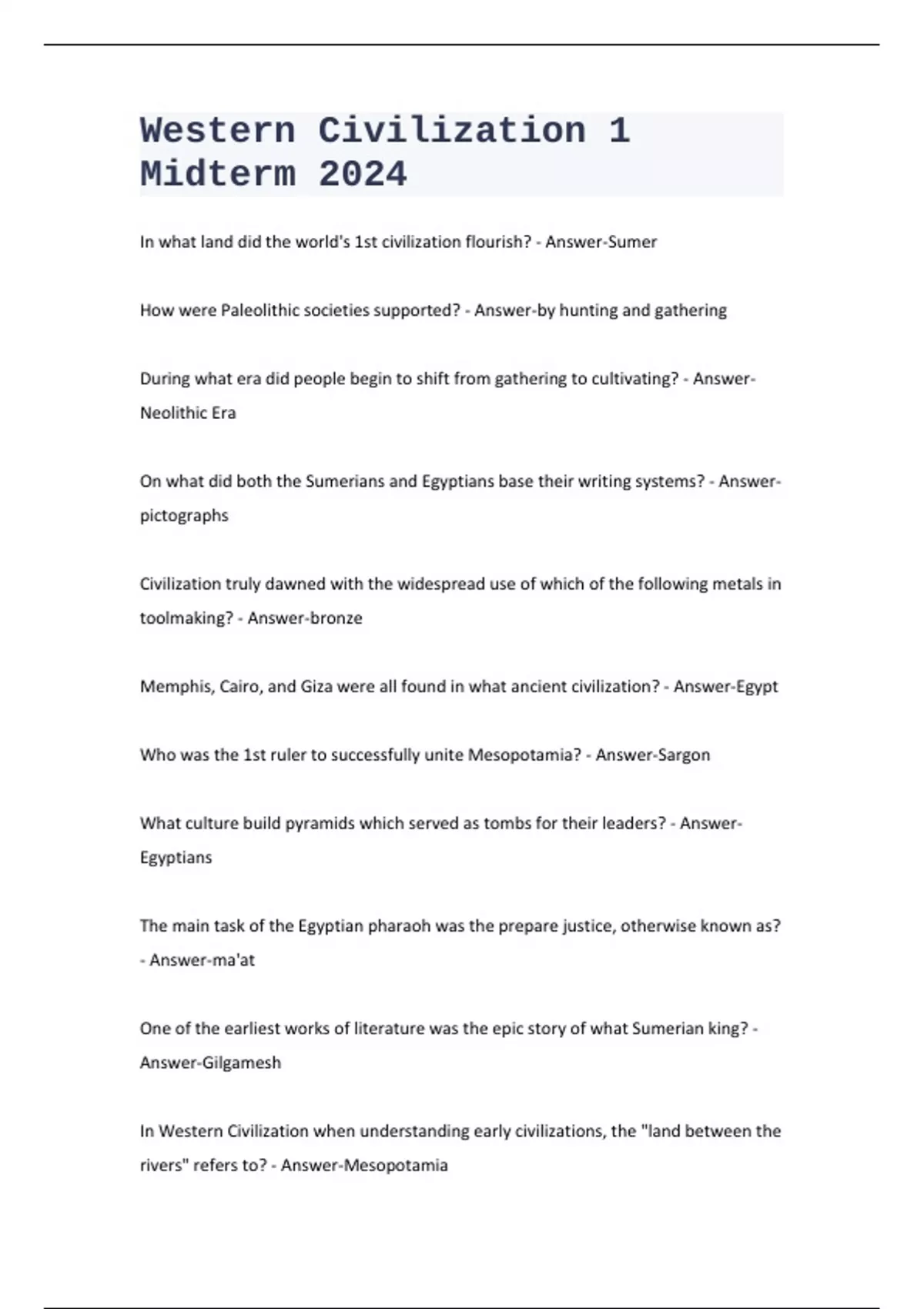 In what land did the world's 1st civilization flourish? - Answer-Sumer How were Paleolithic societies supported? - Answer-by hunting and gathering During what era did people begin to shift from gathering to cultivating? - Answer- Neolithic Era On what did both the Sumerians and Egyptians base their writing systems? - Answer- pictographs Civilization truly dawned with the widespread use of which of the following metals in toolmaking? - Answer-bronze Memphis, Cairo, and Giza were all found in what ancient civilization? - Answer-Egypt Who was the 1st ruler to successfully unite Mesopotamia? - Answer-Sargon What culture build pyramids which served as tombs for their leaders? - Answer- Egyptians The main task of the Egyptian pharaoh was the prepare justice, otherwise known as? - Answer-ma'at One of the earliest works of literature was the epic story of what Sumerian king? - Answer-Gilgamesh In Western Civilization when understanding early civilizations, the "land between the rivers" refers to? - Answer-Mesopotamia Sumerian civilization was linked to what natural formation? - Answer-rivers The imposing towers built by the Mesopotamians that served as religious structures were called___. Layers within these served as offices for the priests. - Answer- ziggurats What was cuneiform? - Answer-the Sumerian writing system Egyptians found that fertility of what river valley which was beneficial to the development of agriculture and farming? - Answer-Nile The land between the Tigris and Euphrates Rivers is known as? - Answer- Mesopotamia The 1st true city to arise in Mesopotamia, in the 4th millennium B.C.E, was? - Answer-Uruk The Epic of Gilgamesh is significant because it? - Answer-is the earliest literary narrative What was the most important innovation of Sumerian civilization? - Answer-writing What architectural elements did the Somerville Public Library incorporate from ancient Greek temples? - Answer-columns, pediment, laurel wreath What was one of the primary ideas of Greek civilization? - Answer-the concept of nothing Which of the following contributed to Sparta's development of a powerful army? - Answer-it's citizens were vastly outnumbered by the people they had captured and enslaved