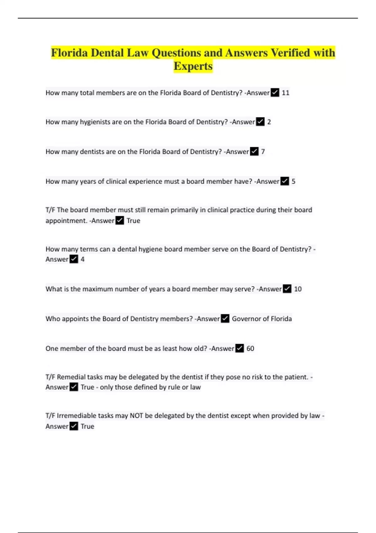 How many total members are on the Florida Board of Dentistry? -Answer 11 How many hygienists are on the Florida Board of Dentistry? -Answer 2 How many dentists are on the Florida Board of Dentistry? -Answer 7 How many years of clinical experience must a board member have? -Answer 5 T/F The board member must still remain primarily in clinical practice during their board appointment. -Answer True How many terms can a dental hygiene board member serve on the Board of Dentistry? - Answer 4 What is the maximum number of years a board member may serve? -Answer 10 Who appoints the Board of Dentistry members? -Answer Governor of Florida One member of the board must be as least how old? -Answer 60 T/F Remedial tasks may be delegated by the dentist if they pose no risk to the patient. - Answer True - only those defined by rule or law