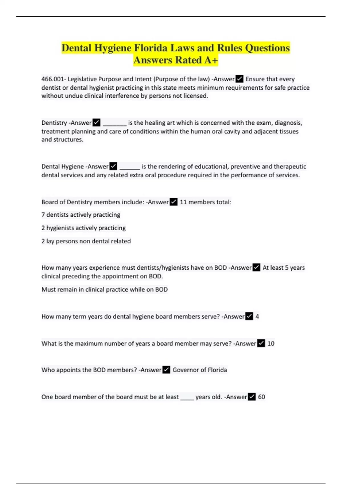 Dental Hygiene Florida Laws and Rules Questions Answers Rated A+