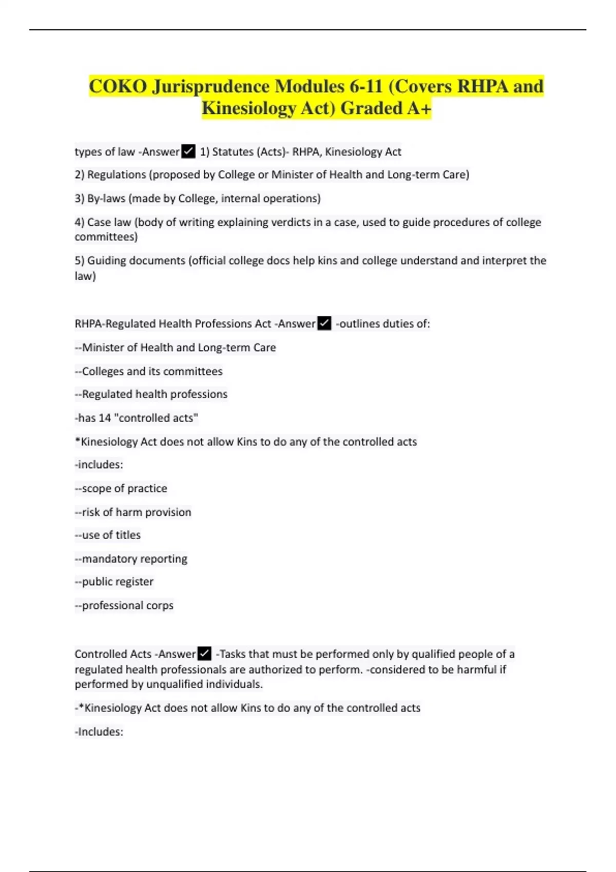 COKO Jurisprudence Modules 6-11 (Covers RHPA and Kinesiology Act) Graded A+