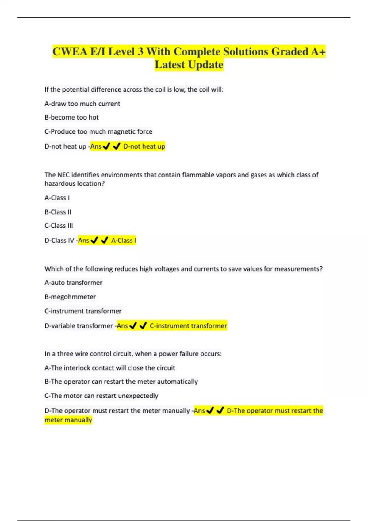 If the potential difference across the coil is low, the coil will: A-draw too much current B-become too hot C-Produce too much magnetic force D-not heat up -Ans️️ D-not heat up The NEC identifies environments that contain flammable vapors and gases as which class of hazardous location? A-Class I B-Class II C-Class III D-Class IV -Ans️️ A-Class I Which of the following reduces high voltages and currents to save values for measurements? A-auto transformer B-megohmmeter C-instrument transformer D-variable transformer -Ans️️ C-instrument transformer
