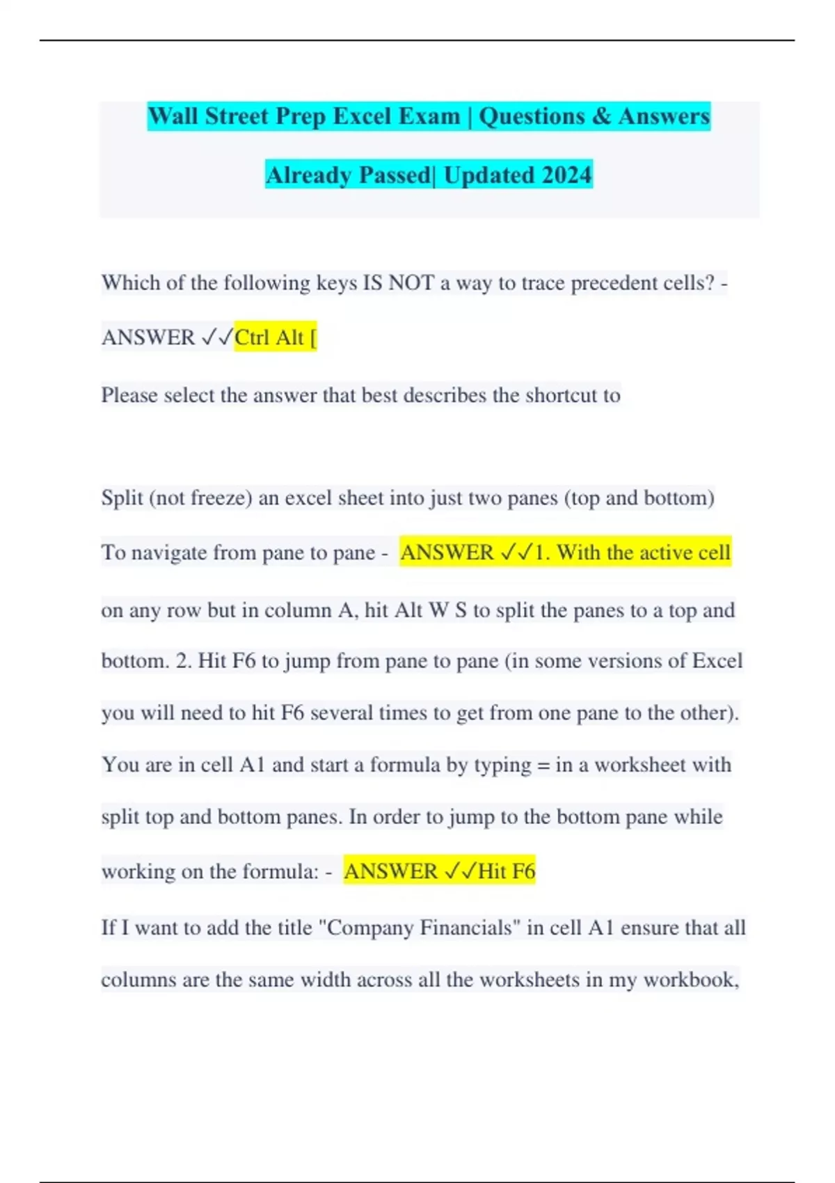 Wall Street Prep Excel Exam | Questions & Answers Already Passed| Updated 2024