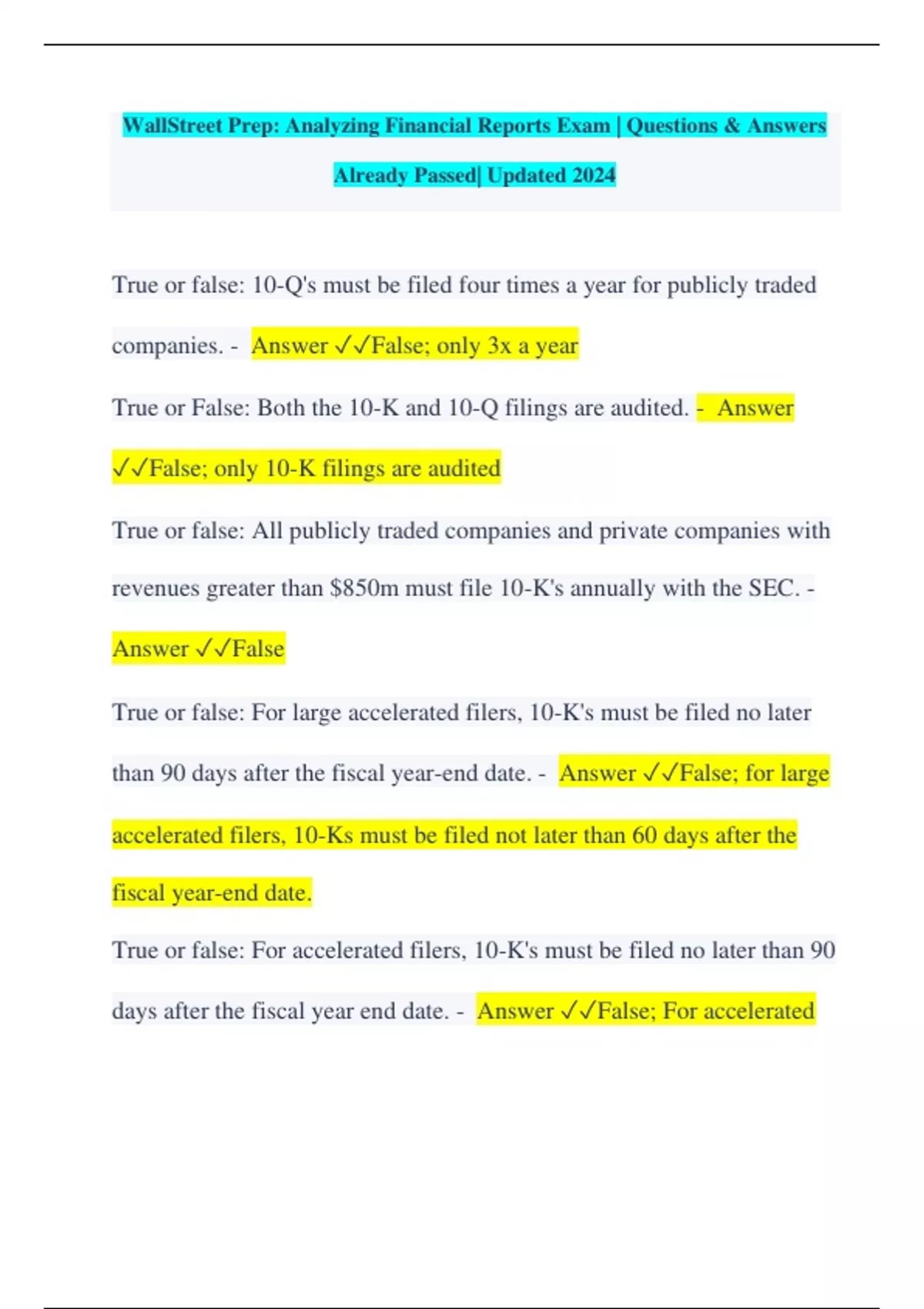 True or false: 10-Q's must be filed four times a year for publicly traded companies. - Answer False; only 3x a year True or False: Both the 10-K and 10-Q filings are audited. - Answer False; only 10-K filings are audited True or false: All publicly traded companies and private companies with revenues greater than $850m must file 10-K's annually with the SEC. - Answer False True or false: For large accelerated filers, 10-K's must be filed no later than 90 days after the fiscal year-end date. - Answer False; for large accelerated filers, 10-Ks must be filed not later than 60 days after the fiscal year-end date.