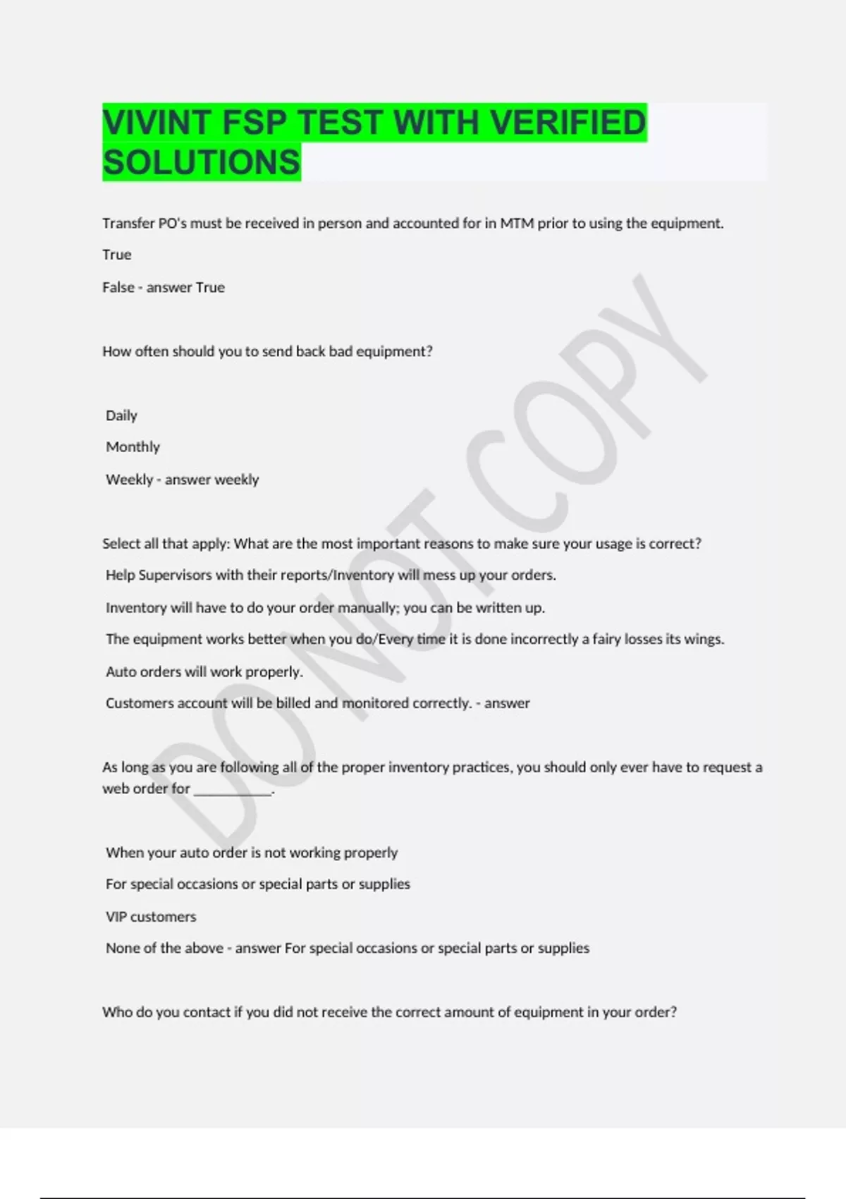 VIVINT FSP TEST WITH VERIFIED SOLUTIONS