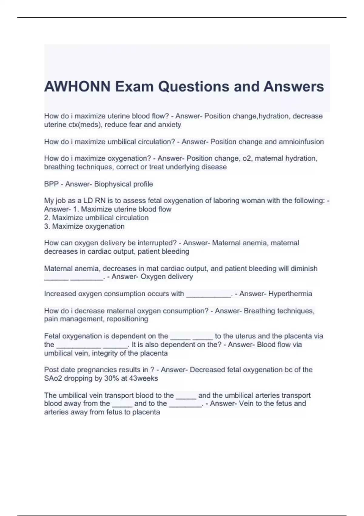 AWHONN Exam Questions and Answers