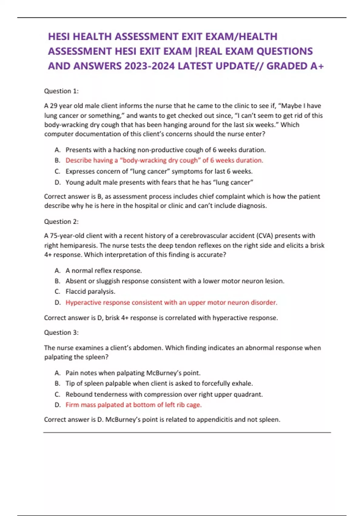 HESI HEALTH ASSESSMENT EXIT EXAM/HEALTH ASSESSMENT HESI EXIT EXAM |REAL EXAM QUESTIONS AND ANSWERS LATEST UPDATE// GRADED A+