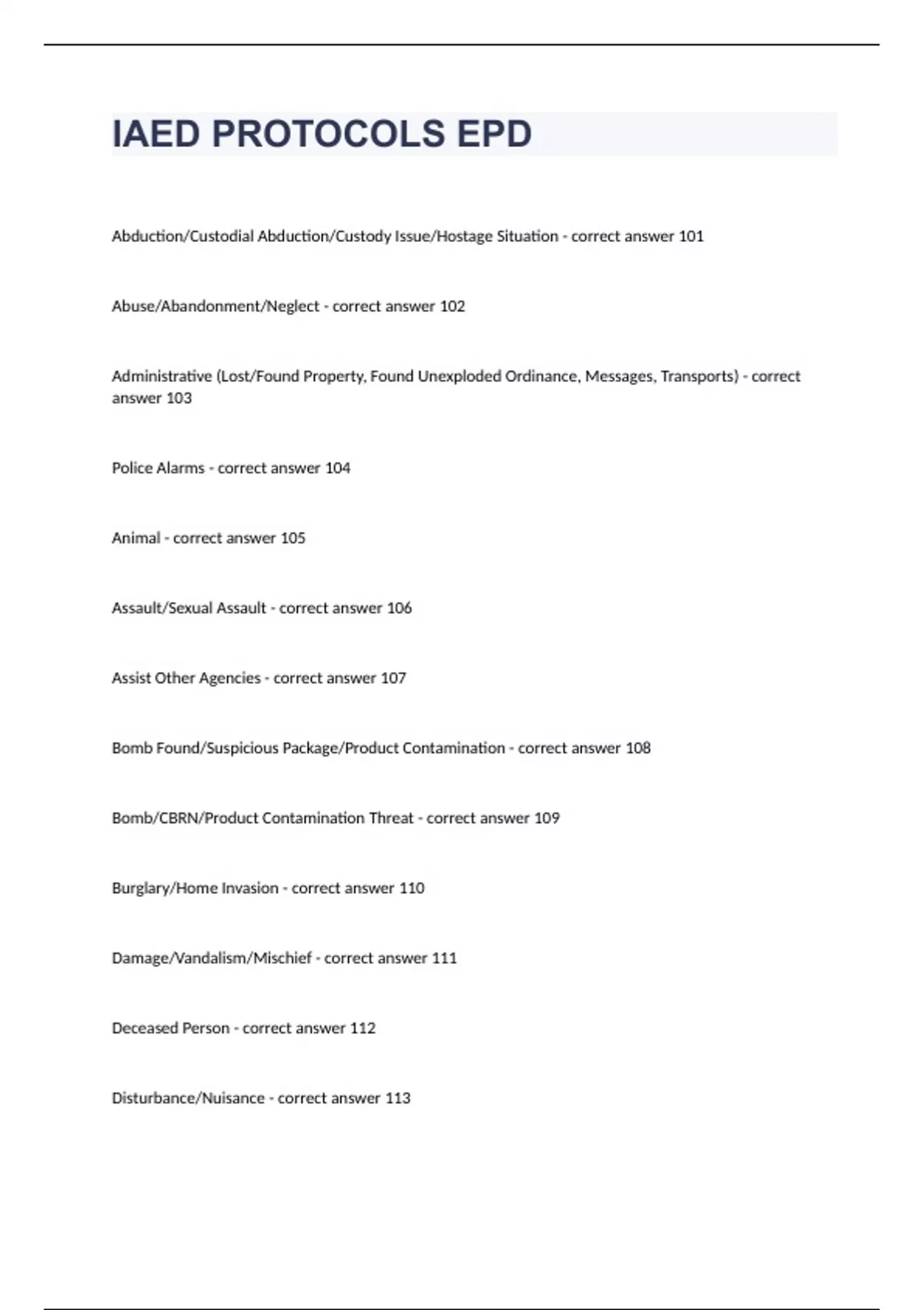 IAED PROTOCOLS EPD Question and answers correctly solved 2023/2024Abduction/Custodial Abduction/Custody Issue/Hostage Situation - correct answer 101 Abuse/Abandonment/Neglect - correct answer 102 Administrative (Lost/Found Property, Found Unexploded Ordinance, Messages, Transports) - correct answer 103 Police Alarms - correct answer 104 Animal - correct answer 105 Assault/Sexual Assault - correct
