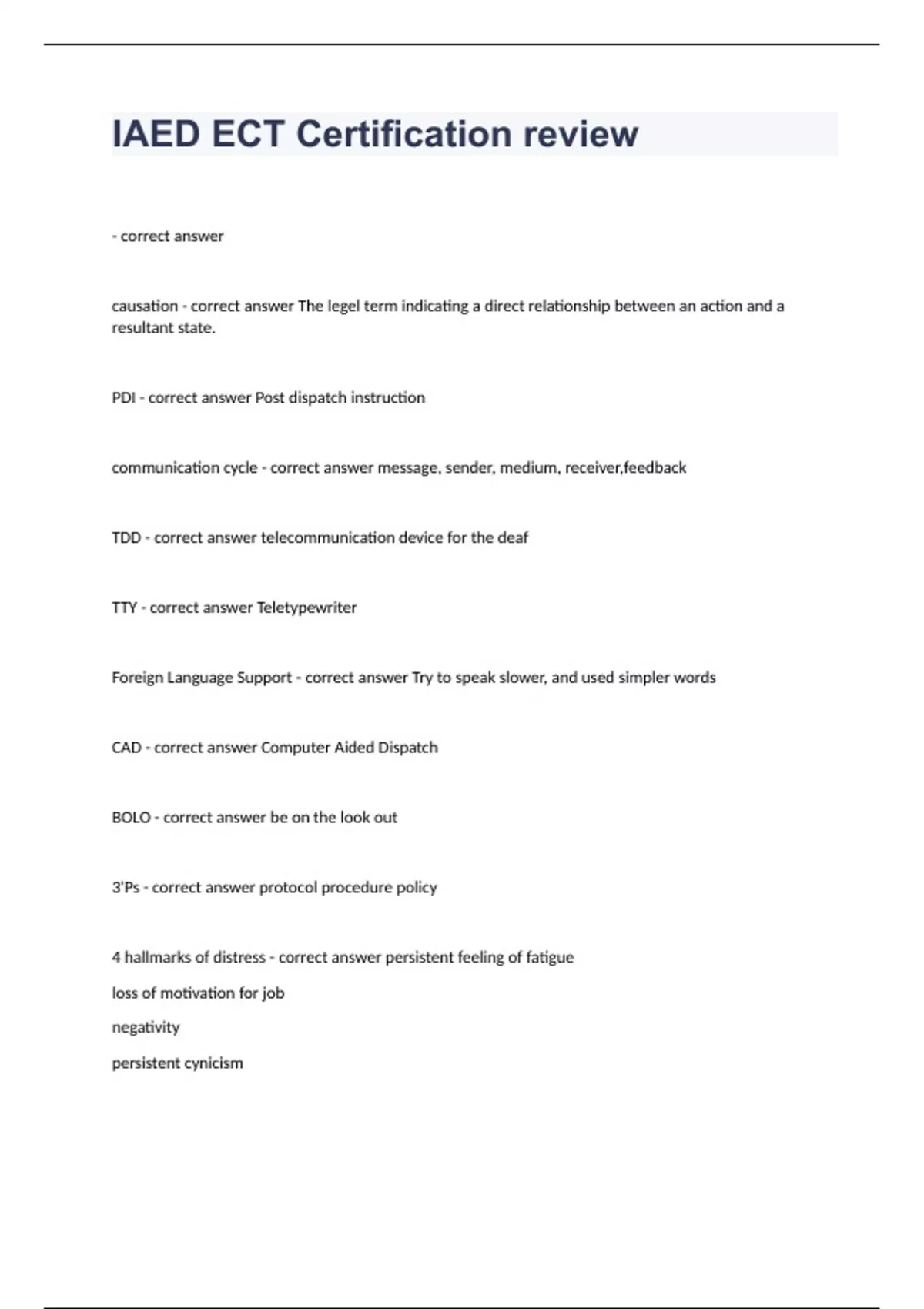 IAED ECT Certification review Question and answers correctly solved 2023/2024- correct answer causation - correct answer The legel term indicating a direct relationship between an action and a resultant state. PDI - correct answer Post dispatch instruction communication cycle - correct answer message, sender, medium, receiver,feedback TDD - correct answer telecommunication device for the deaf TTY - correct answer Teletypewriter