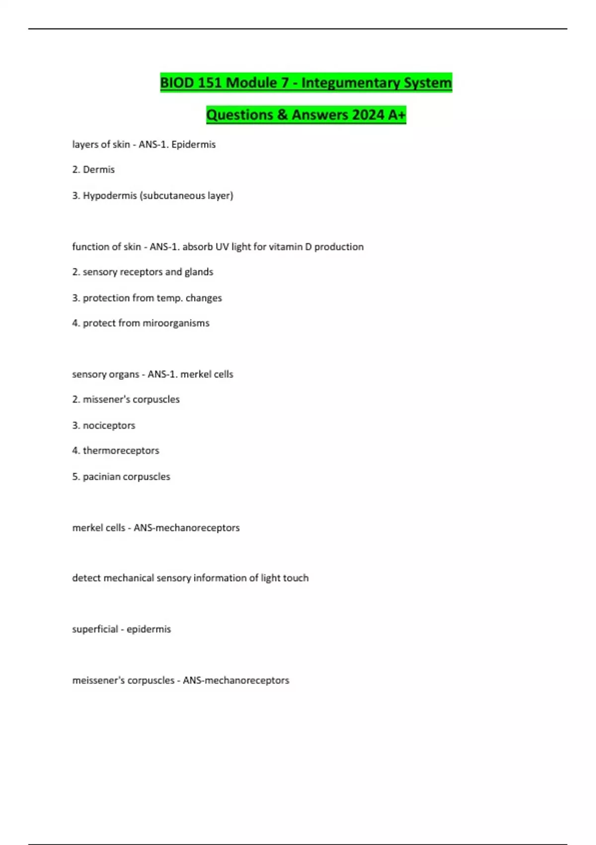 BIOD 151 Module 7 - Integumentary System Questions & Answers 2024 A+ layers of skin - ANS-1. Epidermis 2. Dermis 3. Hypodermis (subcutaneous layer) function of skin - ANS-1. absorb UV light for vitamin D production 2. sensory receptors and glands 3. protection from temp. changes 4. protect from miroorganisms sensory organs - ANS-1. merkel cells 2. missener's corpuscles 3. nociceptors 4. thermoreceptors 5. pacinian corpuscles merkel cells - ANS-mechanoreceptors detect mechanical sensory information of light touch superficial - epidermis meissener's corpuscles - ANS-mechanoreceptors detect mechanical sensory information of light touch and vibrations nociceptors - ANS-pain receptors - several different types thermoreceptors - ANS-temperature sensory - hot and cold changes pacinian corpuscles - ANS- CONTINUES...