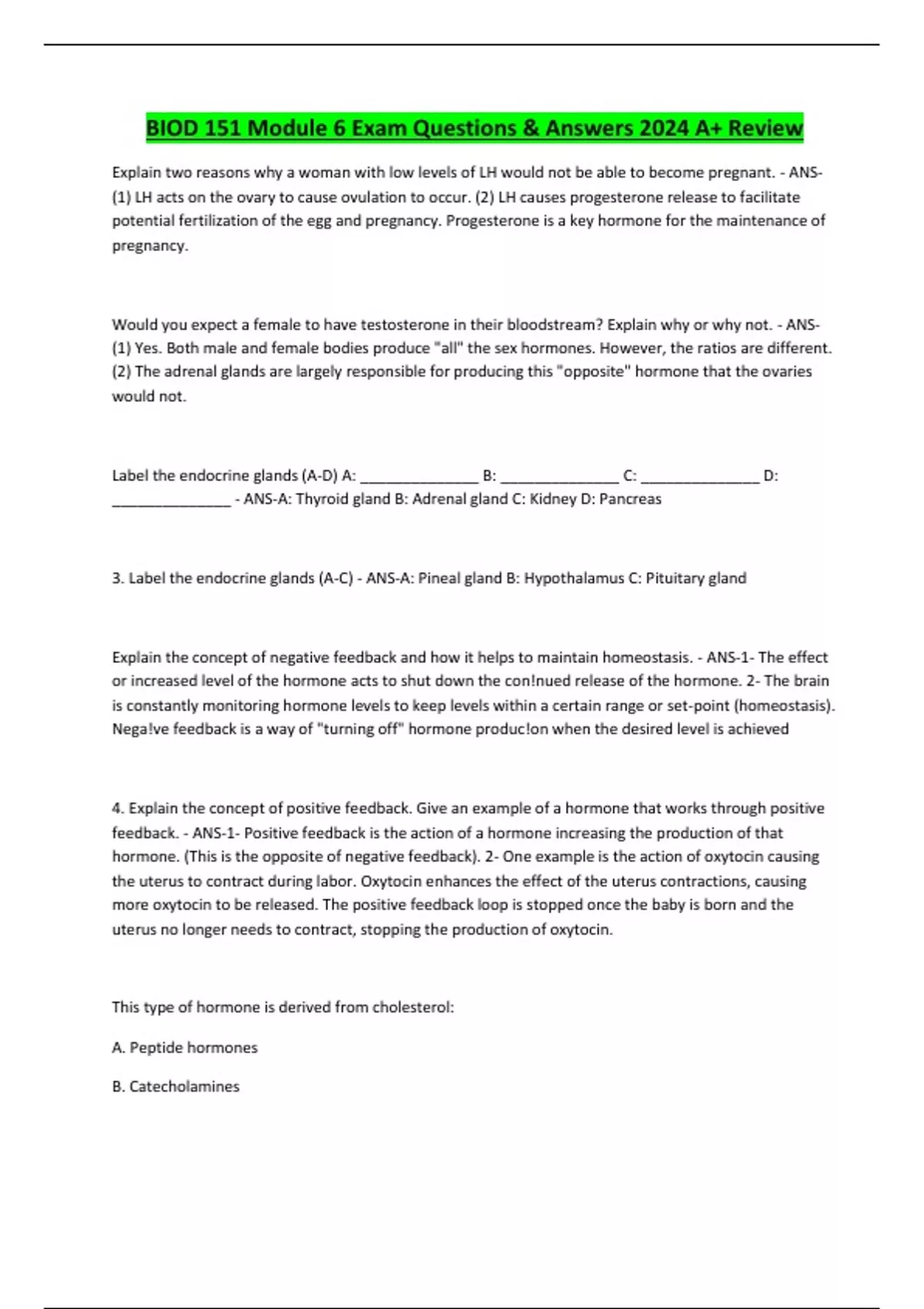 BIOD 151 Module 6 Exam Questions & Answers 2024 A+ Review Explain two reasons why a woman with low levels of LH would not be able to become pregnant. - ANS- (1) LH acts on the ovary to cause ovulation to occur. (2) LH causes progesterone release to facilitate potential fertilization of the egg and pregnancy. Progesterone is a key hormone for the maintenance of pregnancy. Would you expect a female to have testosterone in their bloodstream? Explain why or why not. - ANS- (1) Yes. Both male and female bodies produce "all" the sex hormones. However, the ratios are different. (2) The adrenal glands are largely responsible for producing this "opposite" hormone that the ovaries would not. Label the endocrine glands (A-D) A: ______________ B: ______________ C: ______________ D: ______________ - ANS-A: Thyroid gland B: Adrenal gland C: Kidney D: Pancreas 3. Label the endocrine glands (A-C) - ANS-A: Pineal gland B: Hypothalamus C: Pituitary gland Explain the concept of negative feedback and how it helps to maintain homeostasis. - ANS-1- The effect or increased level of the hormone acts to shut down the con!nued release of the hormone. 2- The brain is constantly monitoring hormone levels to keep levels within a certain range or set-point (homeostasis). Nega!ve feedback is a way of "turning off" hormone produc!on when the desired level is achieved 4. Explain the concept of positive feedback. Give an example of a hormone that works through positive feedback. - ANS-1- Positive feedback is the action of a hormone increasing the production of that hormone. (This is the opposite of negative feedback). 2- One example is the action of oxytocin causing the uterus to contract during labor. Oxytocin enhances the effect of the uterus contractions, causing more oxytocin to be released. The positive feedback loop is stopped once the baby is born and the uterus no longer needs to contract, stopping the production of oxytocin. This type of hormone is derived from cholesterol: A. Peptide hormones B. Catecholamines C. Steroid hormones D. Tyrosine - ANS-C 5. This type of hormone is derived from proteins: A. Peptide hormones B. Catecholamines C. Steroid hormones D. Tyrosine - ANS-A 6. Growth hormone____ A. is most active during childhood/adolescence. B. can cause disease if levels are not correct. C. cannot affect an adult. D. A &B - ANS-D 6. Growth hormone______ CONTINUES...