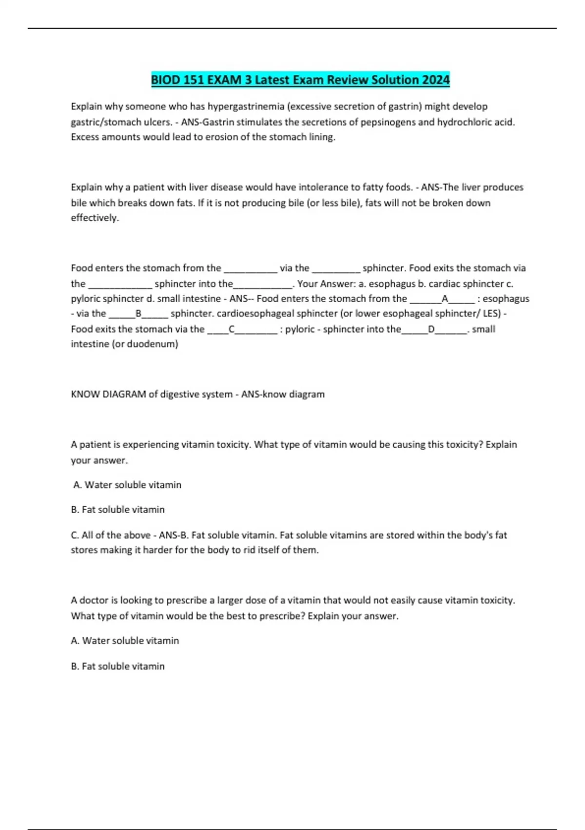 BIOD 151 EXAM 3 Latest Exam Review Solution 2024 Explain why someone who has hypergastrinemia (excessive secretion of gastrin) might develop gastric/stomach ulcers. - ANS-Gastrin stimulates the secretions of pepsinogens and hydrochloric acid. Excess amounts would lead to erosion of the stomach lining. Explain why a patient with liver disease would have intolerance to fatty foods. - ANS-The liver produces bile which breaks down fats. If it is not producing bile (or less bile), fats will not be broken down effectively. Food enters the stomach from the __________ via the _________ sphincter. Food exits the stomach via the ____________ sphincter into the___________. Your Answer: a. esophagus b. cardiac sphincter c. pyloric sphincter d. small intestine - ANS-- Food enters the stomach from the ______A_____ : esophagus - via the _____B_____ sphincter. cardioesophageal sphincter (or lower esophageal sphincter/ LES) - Food exits the stomach via the ____C________ : pyloric - sphincter into the_____D______. small intestine (or duodenum) KNOW DIAGRAM of digestive system - ANS-know diagram A patient is experiencing vitamin toxicity. What type of vitamin would be causing this toxicity? Explain your answer. A. Water soluble vitamin B. Fat soluble vitamin C. All of the above - ANS-B. Fat soluble vitamin. Fat soluble vitamins are stored within the body's fat stores making it harder for the body to rid itself of them. A doctor is looking to prescribe a larger dose of a vitamin that would not easily cause vitamin toxicity. What type of vitamin would be the best to prescribe? Explain your answer. A. Water soluble vitamin B. Fat soluble vitamin C. All of the above - ANS-A. Water soluble vitamin. Fat soluble vitamins are stored within the body's fat stores making it harder for the body to rid itself of them. Explain which digestive system functions are carried out by the small intestine. - ANS-Digestion: Chemical and mechanical: In the small intestine chemical digestion continues as enzymes from the pancreatic juices break down starches and proteins, and begin digestion of fat. Mechanical digestion continues as bile breaks down fat into smaller pieces. Absorption: begins as digested food molecules, water and fat are absorbed into the bloodstream. Name and explain the four main functions performed by the digestive system. - ANS-The digestive system has four main roles that it performs: ingestion, digestion, absorption, and defecation. Ingestion is when food enters the mouth. Digestion or food breakdown occurs when food is moved, mixed, and exposed to enzymes along the gastrointestinal tract. Digestion can be divided into two parts: mechanical and chemical digestion. Mechanical digestion occurs when food is broken down into smaller pieces. This occurs when the teeth chew food, when the stomach mixes food, and as food is moved along the gastrointestinal tract. Chemical digestion is the breakdown of food by enzymes. Absorption is the process of moving digested food into the blood stream. Defecation is the excretion of indigestible food from the anus. Describe parietal cells and chief cells: name their location, secretions and purposes. - Which of the following statements is false? A. The ileocecal valve controls the entrance of chyme into to the large intestine. B. Taste buds are located on the surface of the mouth and the wall of the pharynx. C. The liver, pancreas, and tongue are considered accessory organs to the digestive system. D. The stomach is located along the right side of the abdomen below the diaphragm. - ANS-D. True/False: Lipids can be divided into three categories: saturated fat, unsaturated fat, and cholesterol. - ANS-TRUE True/False: Anabolism combines smaller molecules to make larger molecules. - ANS-TRUE True/False: The oropharynx is the most superior region of the pharynx. - ANS-FALSE (the nasopharnyx) True/False: The nasopharynx is the most superior region of the pharynx. - ANS-TRUE True/False: The pharynx has three types of skeletal muscle: circumferential, longitudinal and oblique. - ANS-False (It only has two; it does not include an oblique layer) True/False: The pharynx has two types of skeletal muscle: circumferential and oblique. - CONTINUES....