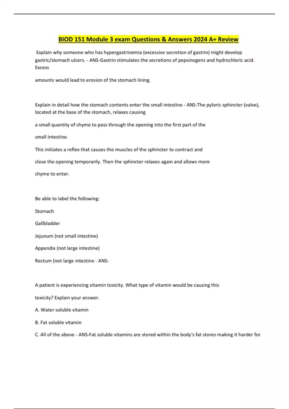 BIOD 151 Module 3 exam Questions & Answers 2024 A+ Review Explain why someone who has hypergastrinemia (excessive secretion of gastrin) might develop gastric/stomach ulcers. - ANS-Gastrin stimulates the secretions of pepsinogens and hydrochloric acid. Excess amounts would lead to erosion of the stomach lining. Explain in detail how the stomach contents enter the small intestine - ANS-The pyloric sphincter (valve), located at the base of the stomach, relaxes causing a small quantity of chyme to pass through the opening into the first part of the small intestine. This initiates a reflex that causes the muscles of the sphincter to contract and close the opening temporarily. Then the sphincter relaxes again and allows more chyme to enter. Be able to label the following: Stomach Gallbladder Jejunum (not small intestine) Appendix (not large intestine) Rectum (not large intestine - ANSA patient is experiencing vitamin toxicity. What type of vitamin would be causing this toxicity? Explain your answer. A. Water soluble vitamin B. Fat soluble vitamin C. All of the above - ANS-Fat soluble vitamins are stored within the body's fat stores making it harder for the body to rid itself of them. Explain which digestive system functions are carried out by the large intestine. - ANS-Absorption: In the large intestine water and electrolytes are reabsorbed and vitamins are absorbed. Defecation: Feces travel to the rectum where it is excreted via the anus. Describe parietal cells and chief cells: name their location, secretions and purposes. - ANS-T...