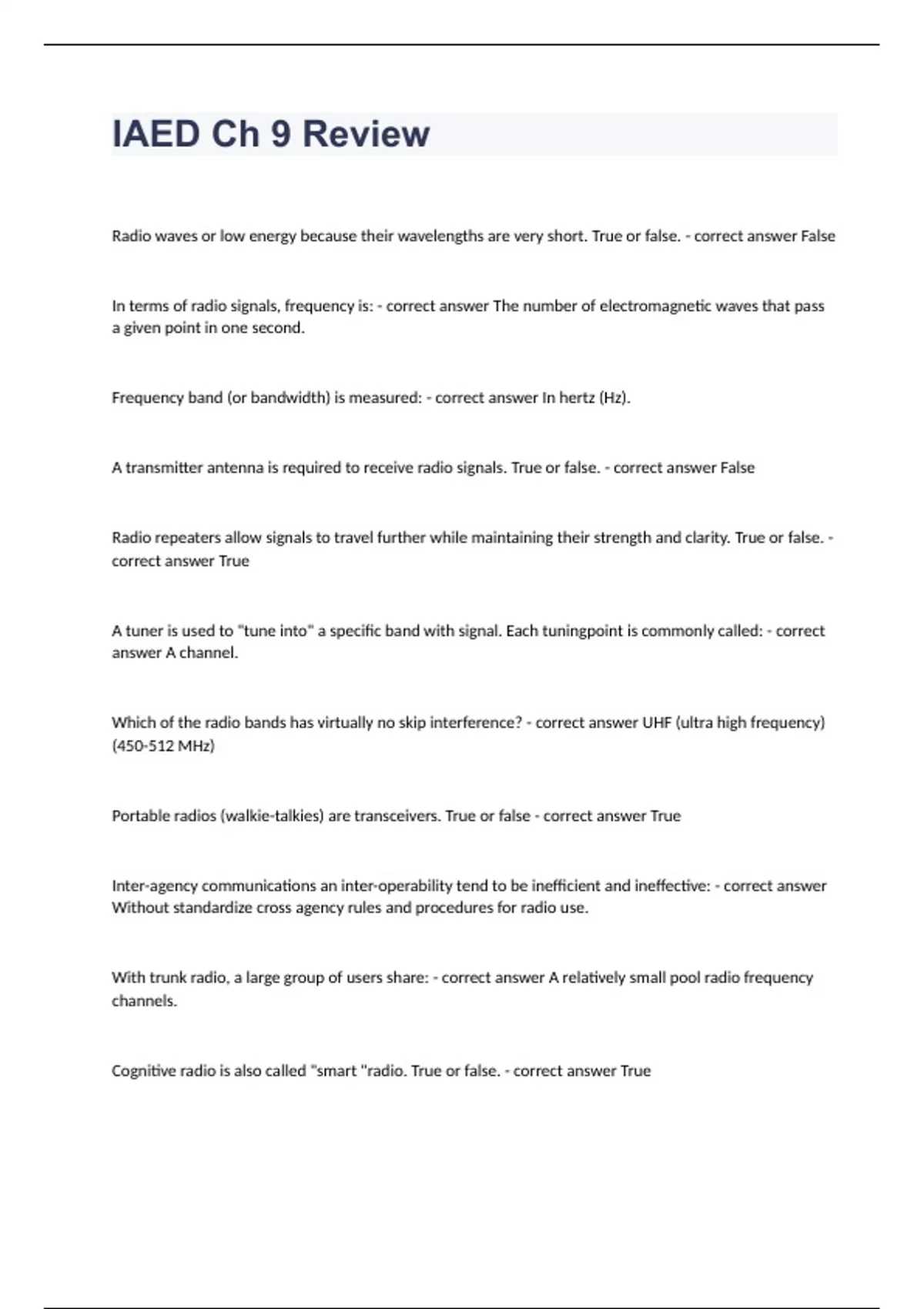 IAED Ch 9 Review Questions with complete solution 2023/2024 Radio waves or low energy because their wavelengths are very short. True or false. - correct answer False In terms of radio signals, frequency is: - correct answer The number of electromagnetic waves that pass a given point in one second. Frequency band (or bandwidth) is measured: - correct answer In hertz (Hz). A transmitter antenna is required to receive radio signals. True or false. - correct answer False Radio repeaters a