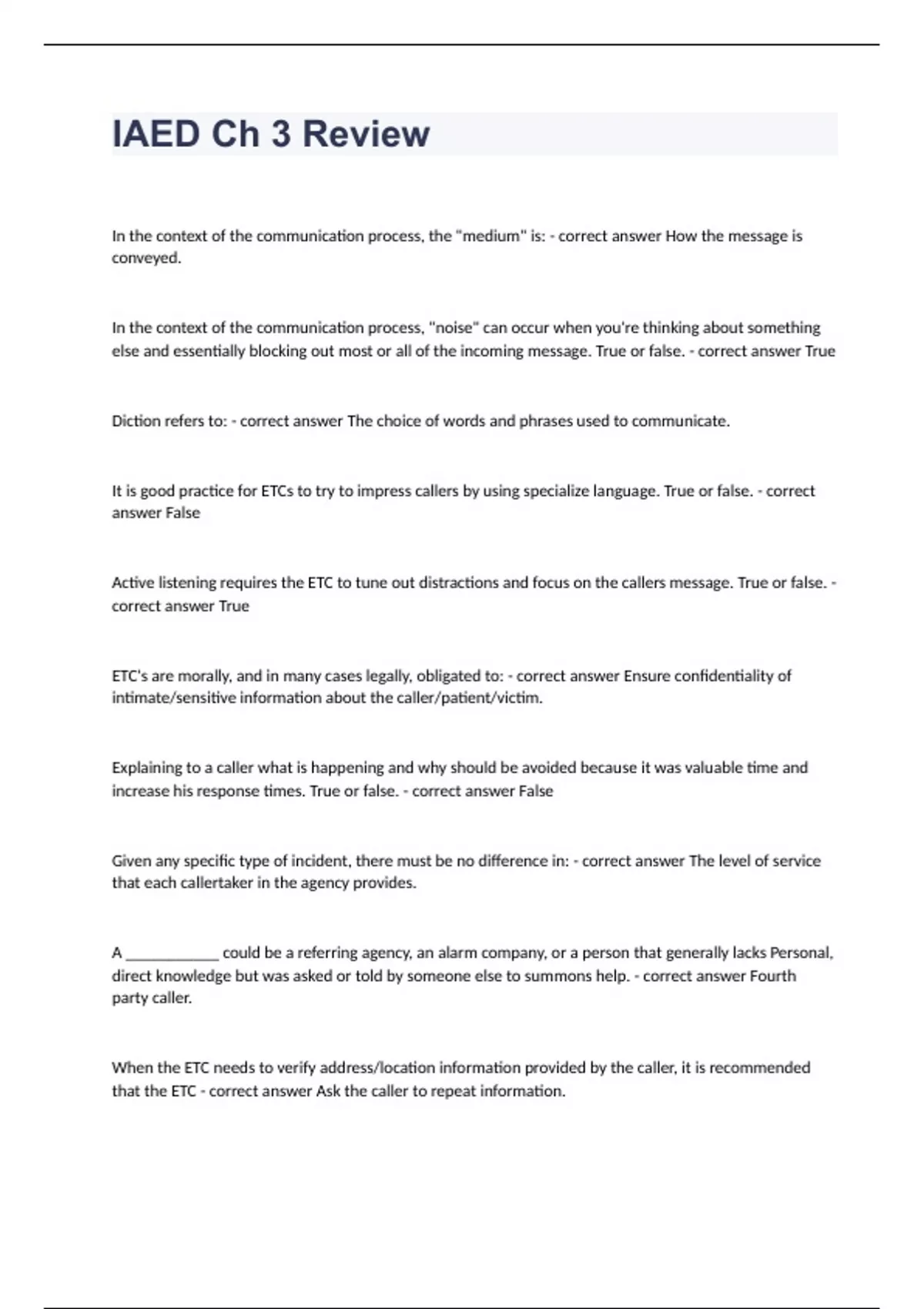 IAED Ch 3 Review Question and answers already passed 2023/2024In the context of the communication process, the "medium" is: - correct answer How the message is conveyed. In the context of the communication process, "noise" can occur when you're thinking about something else and essentially blocking out most or all of the incoming message. True or false. - correct answer True Diction refers to: - correct answer The choice of words and phrases used to communicate.